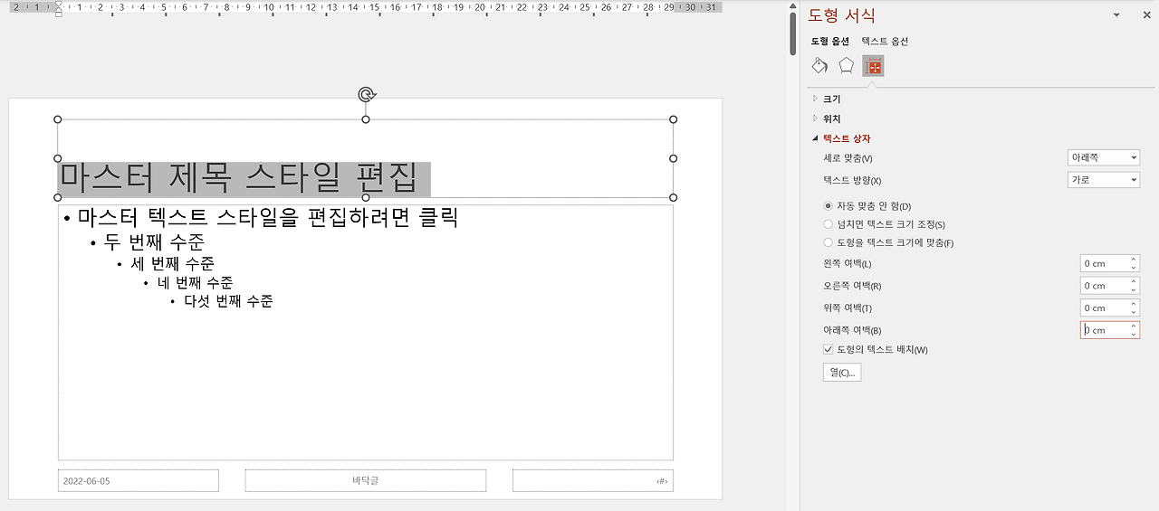 제목 줄의 텍스트 박스 여백은 모두 0cm로 지정합니다. 텍스트 상자 여백이 잡혀있으면 보이는 위치가 틀어질 수 있거든요. 덧붙여서 텍스트 상자의 '자동 맞춤 안 함'을 선택해서 상자의 크기와 텍스트 크기가 서로 영향을 받지 않도록 설정합니다.