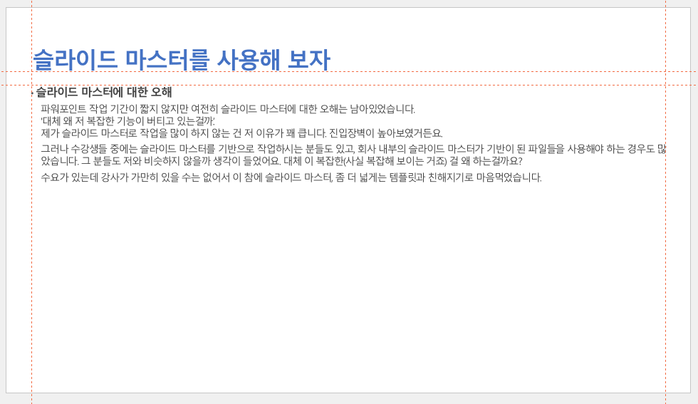 그러나 수강생들 중에는 슬라이드 마스터를 기반으로 작업하시는 분들도 있고, 회사 내부의 슬라이드 마스터가 기반이 된 파일들을 사용해야 하는 경우도 많았습니다. 그분들도 저와 비슷하지 않을까 생각이 들었어요. 대체 이 복잡한(사실 복잡해 보이는 거죠) 걸 왜 하는 걸까요?
