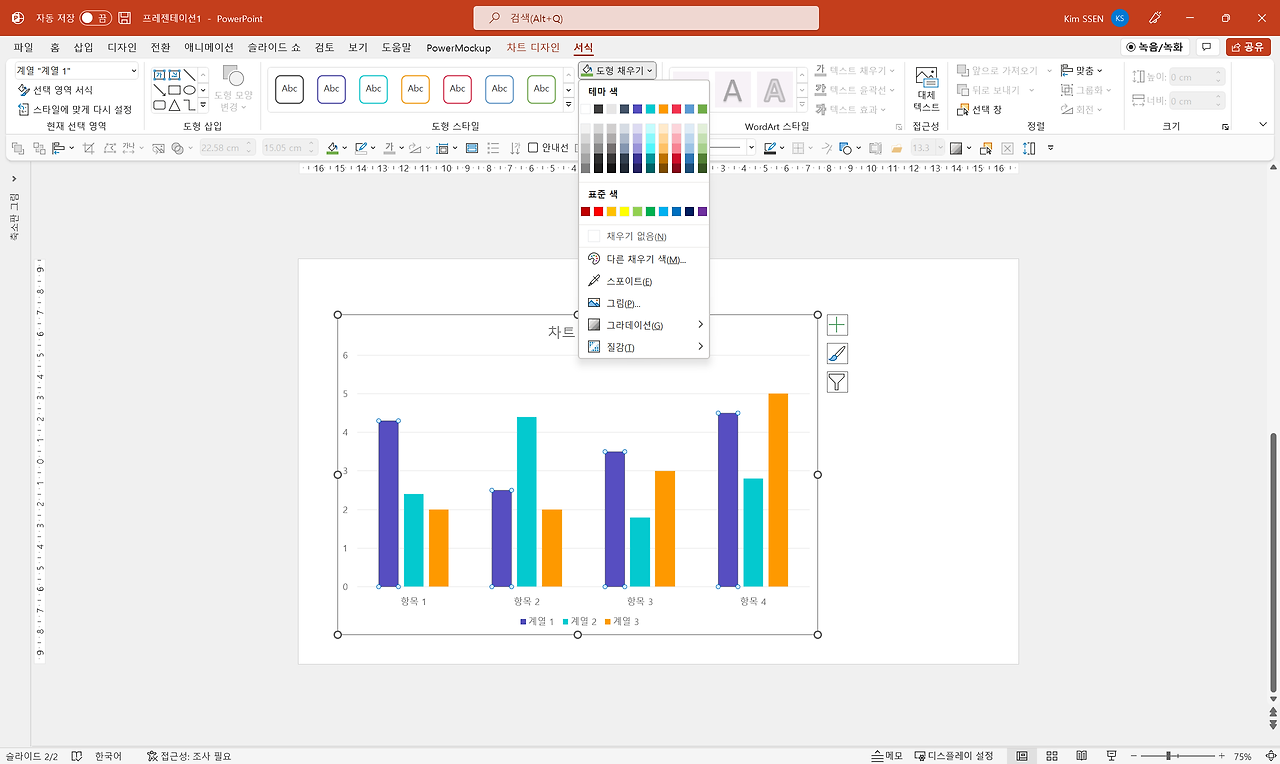 이 기능에 대해 설명하는 이유는 파워포인트 작업을 효율적으로 하기 위해 사용하는 색들도 미리 컨트롤을 하기 위함입니다. 이렇게 색을 적용했을 때 가장 적절하게 사용될 수 있는 부분은 차트입니다. 기본 그래프의 색들을 일일이 스포이드로 지정하는 것보다 미리 컬러를 지정해 놓으면 강조색에 넣어둔 색으로 그래프를 자동으로 설정할 수 있습니다.