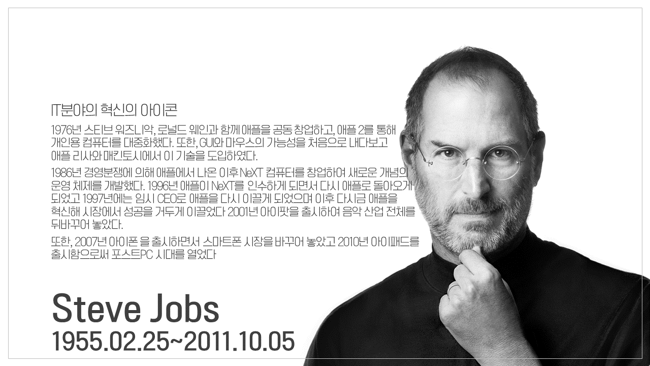 여기까지 작업하고 나면 텍스트의 기본 편집은 마무리가 됐다고 보면 됩니다. 여기에서 이미지가 더해지면 거기에 맞춰서 줄이 나뉘는 경우도 있고, 텍스트의 위치를 조금 수정해서 레이아웃을 바꾸기도 하죠. 아래는 그 과정까지 완료한 최종 슬라이드입니다. 왠지 스티브 잡스 관련 자료에는 이 사진이 들어가야 할 것 같더라구요. 사진은 flickr에서 가져 왔구요. 포스팅 하단의 링크에서 확인할 수 있습니다.