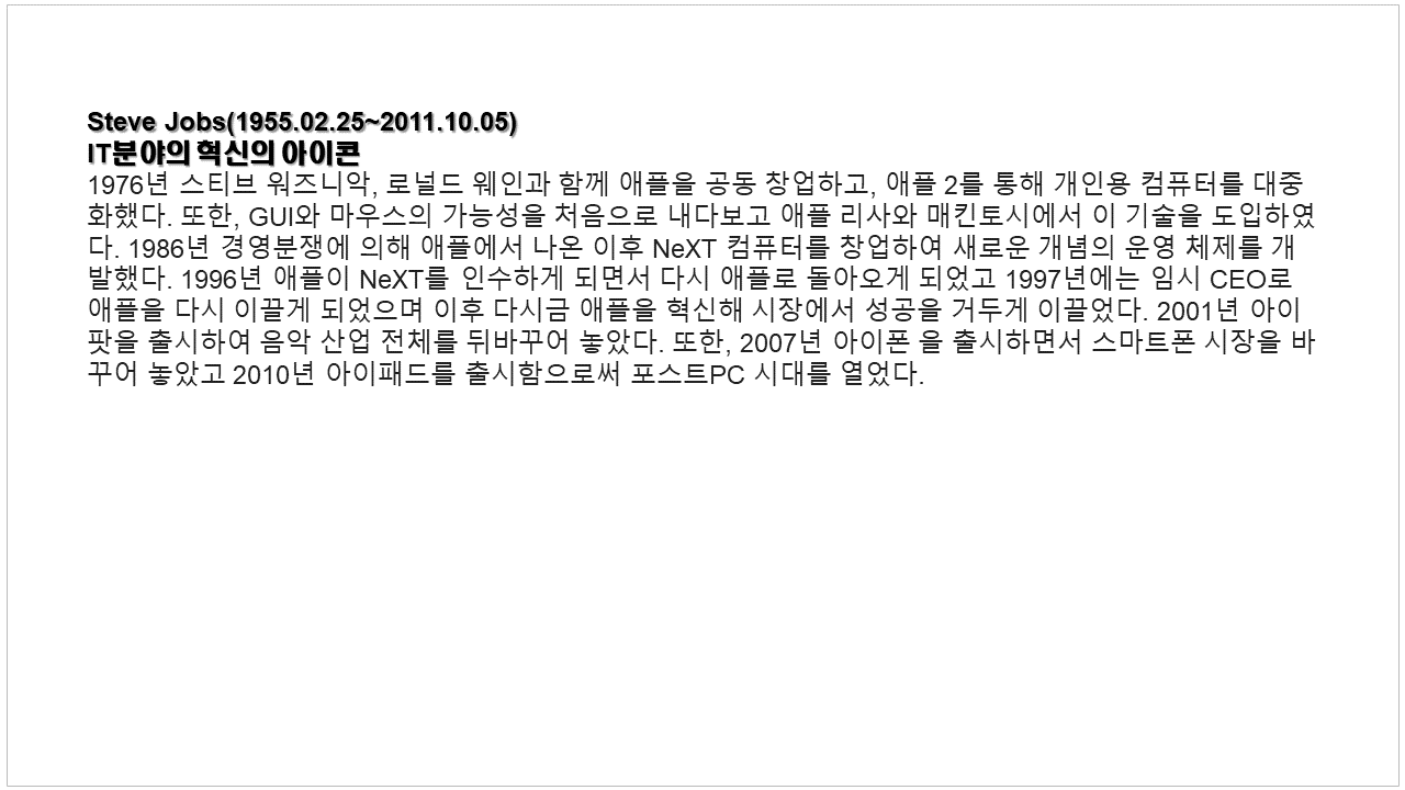 우선 이 슬라이드에서 강조되어야 할 순서대로 본다면 SteveJobs(..)>IT분야의>1976년...일 것입니다. 이 순서는 텍스트의 크기와도 직결이 되죠. 현재는 전체 텍스트의 크기가 모두 샅은 상태에서 효과들만 들어가 있다 보니 'IT분야의~'라는 부분이 가장 커 보이는 현상이 발생합니다. 강조하는 순서에 따라 텍스트 크기를 좀 손보겠습니다.