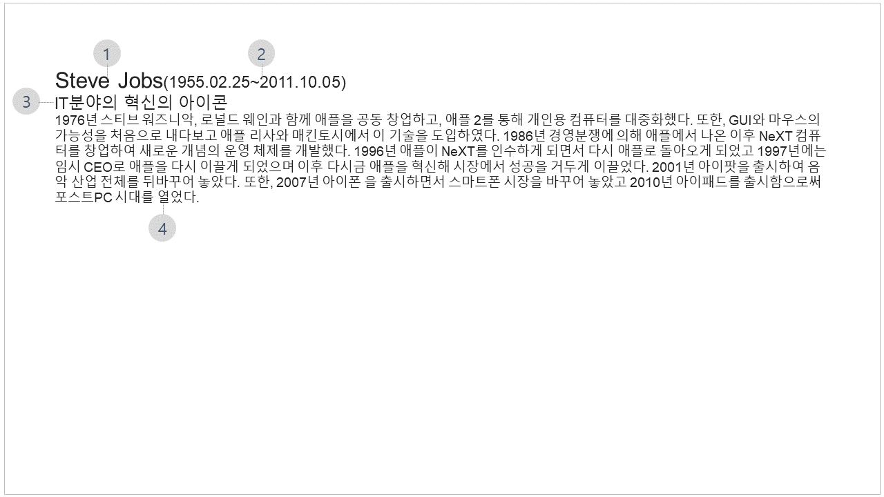 호흡이 긴 텍스트들의 덩어리이긴 하지만 최소한의 단위로 나눌 수는 있을 것입니다. 여기에서는 스티브잡스의 이름과 생년-사망 월일, 그를 표현하는 대표적인 문장, 그리고 세부적인 내용들이 있네요. 그럼 각 문장의 성격에 따라 텍스트들의 크기나 위치등을 대략적으로 계획할 수 있습니다.