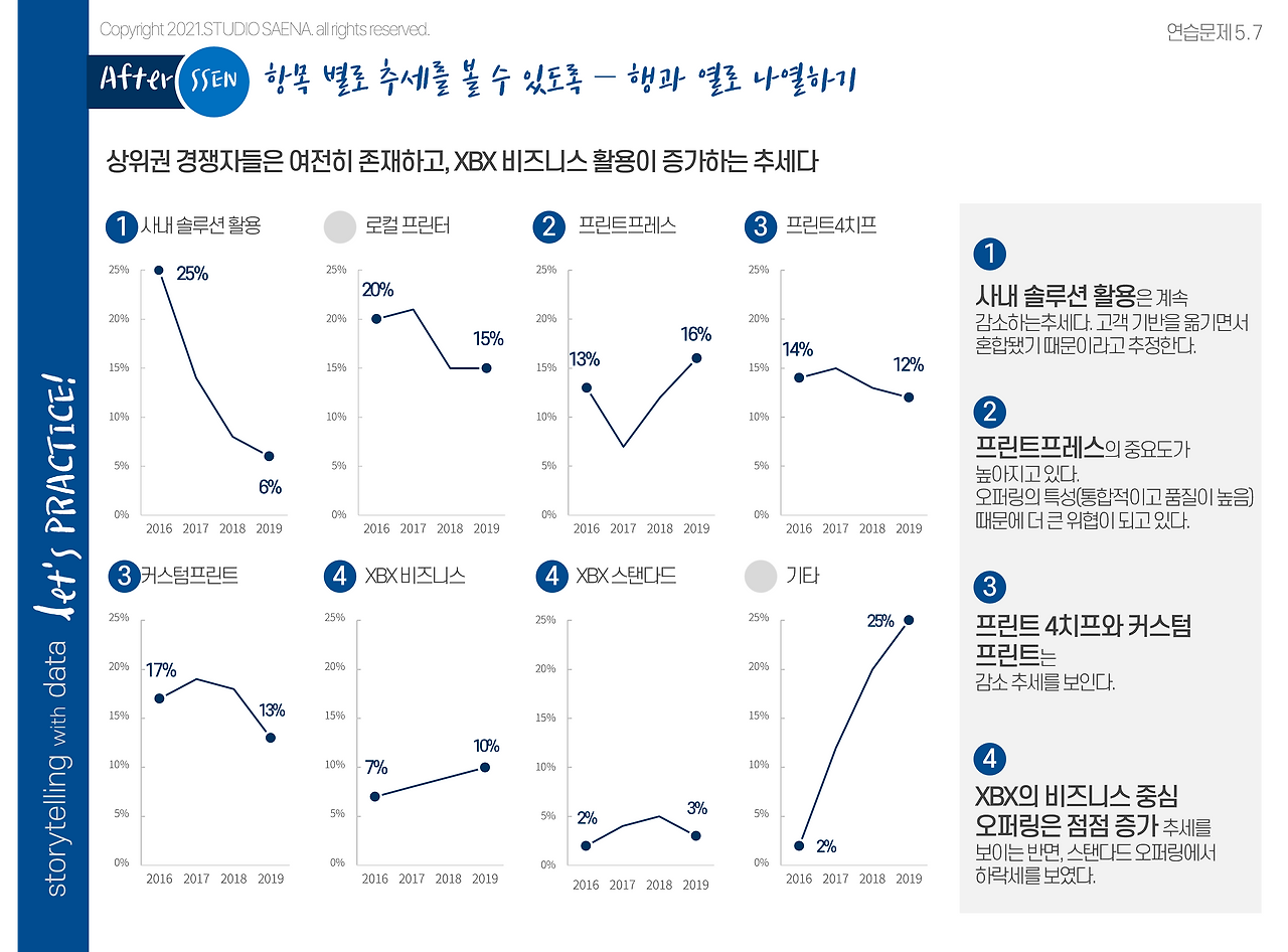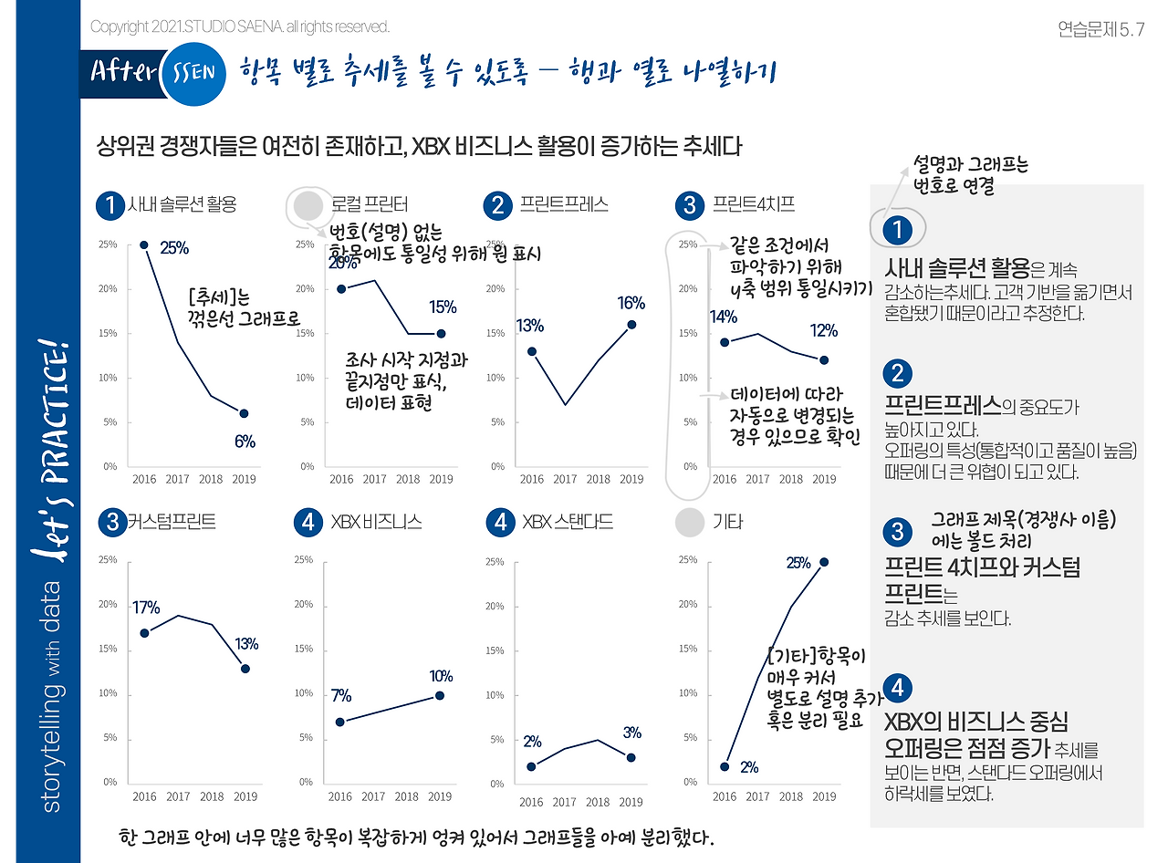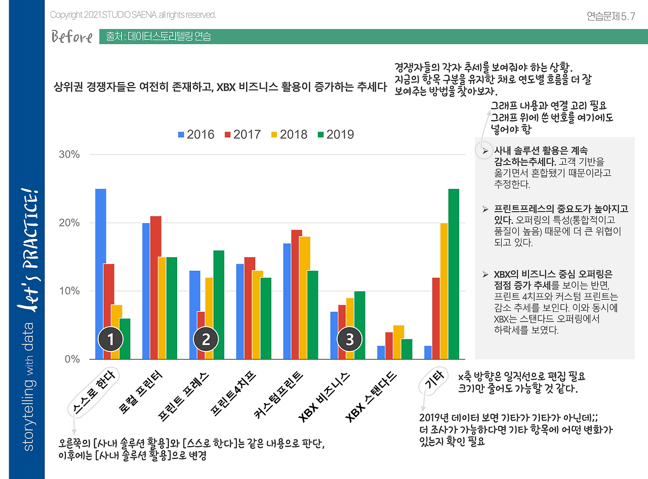 이번 그래프는 복잡한 데다가 화려해 보였습니다. 총 8개의 항목의 x축은 기울어져 있었고, 항목별로 4개 시점을 한 공간에 표현하려다 보니 그래프가 겹쳐서 표현되었습니다. 한 가지 좋은 점은 겹쳐진 그래프 덕분에 막대그래프로도 추세가 보인다는 점입니다. 1,2,3번의 항목들을 강조하고자 번호를 넣었지만 정작 오른쪽의 텍스트가 들어가는 구간에서는 모든 항목들을 설명하고 있네요. 이런 케이스가 바로 [모든 내용이 중요한] 데이터 장표 되겠습니다.