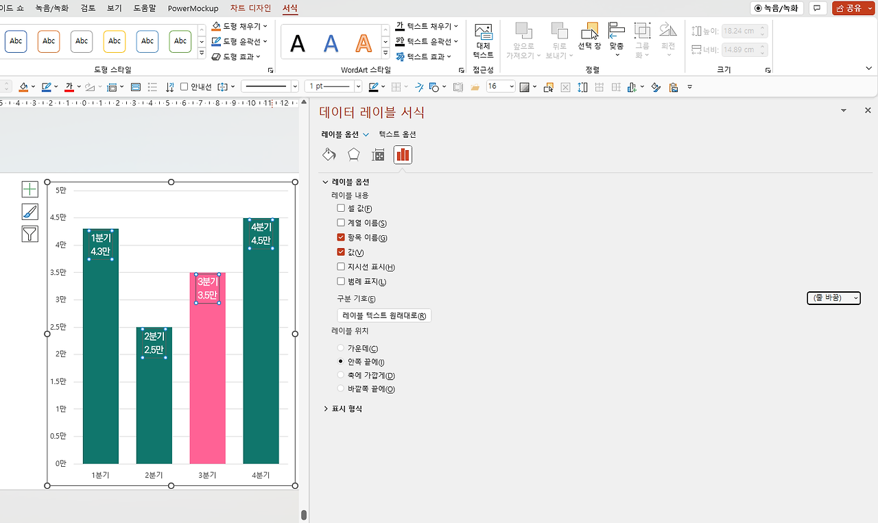 우리가 입력한 데이터는 데이터 레이블의 형태로 그래프에 직접 삽입할 수 있는데요, 오피스 프로그램의 옵션을 이용하면 이 자리에 들어갈 내용을 편집할 수 있습니다.