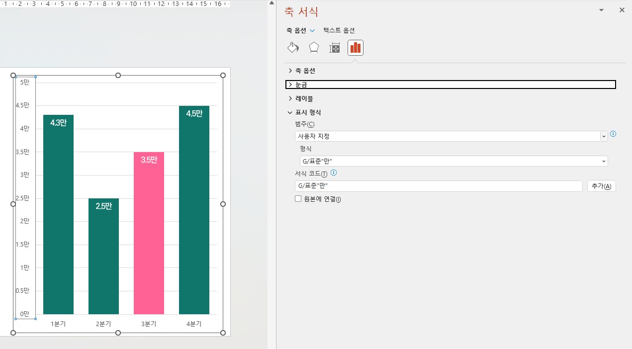 물론 같은 단위가 반복되는 것은 보기에도 좋지 않기 때문에 그래프 위에 따로 (단위: 만) 식으로 단위를 입력하는 방법을 좀 더 추천합니다.