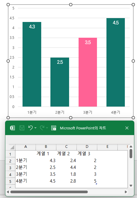 왼쪽 그래프의 x축 항목을 보죠. 데이터 입력해서 보이는 것처럼 ".. 분기"를 직접 입력하여 x에 단위명을 입력할 수 있습니다.