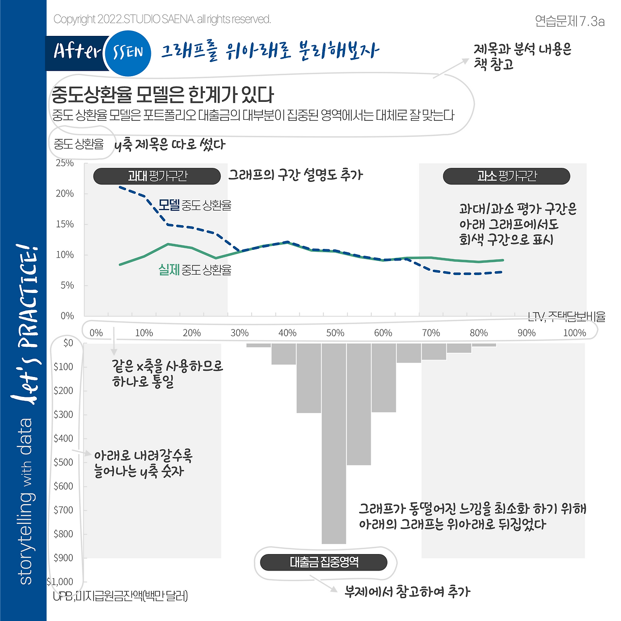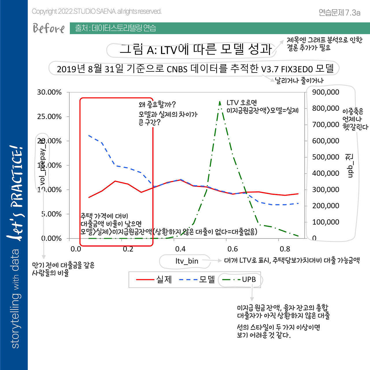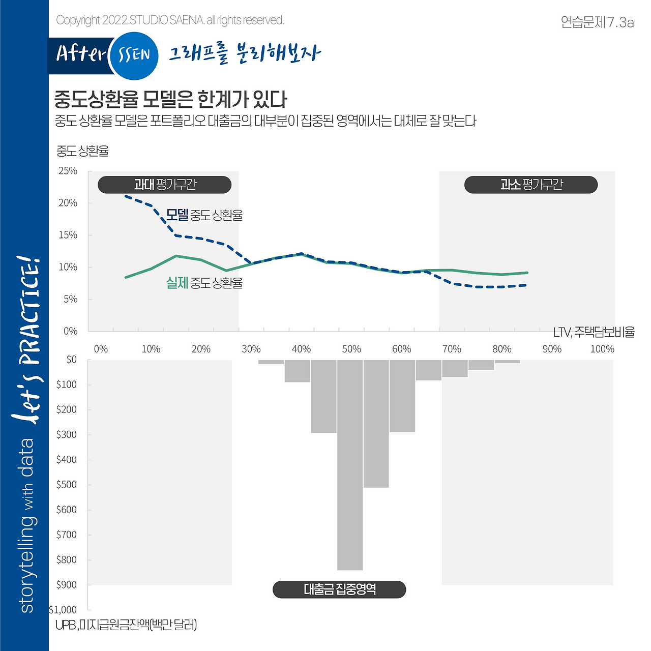 전문용어가 익숙하다면 그래프의 의도나 방향은 파악하기 쉬울 수 있습니다. 그러나 잘못하면 그래프 자체가 설명하는 내용 이상으로 깊숙이 빠져들 수도 있습니다. 책의 내용을 확인해본 결과 이 그래프에서의 포인트는 [일정 구간에서 모델과 실제의 상환율은 다르다] 였는데요, 저는 대출금과 상관관계가 있나 헛다리를 짚은 셈이었습니다.