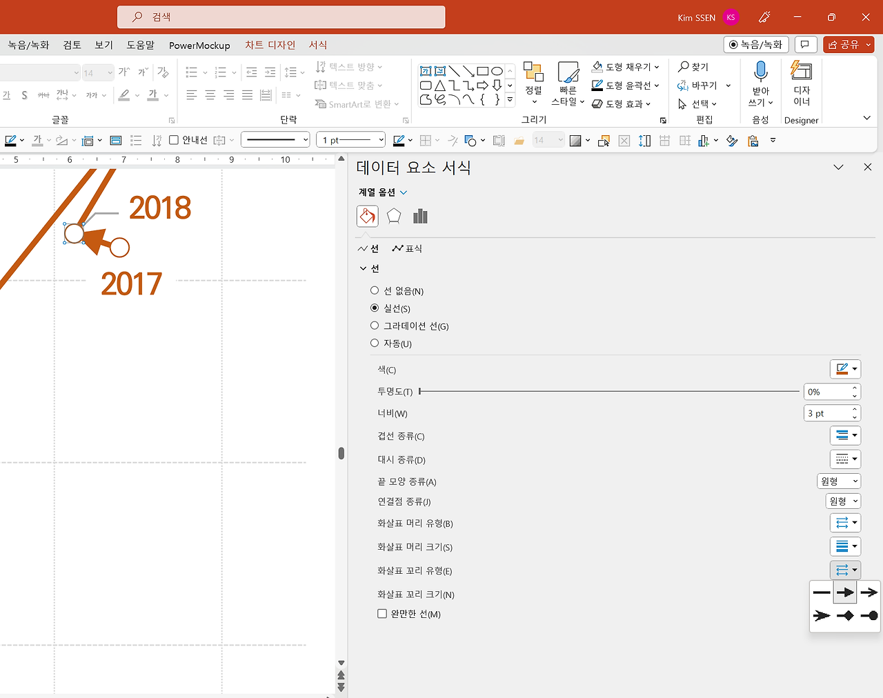 그래서 이 그래프에도 각 선의 끝 지점의 화살표를 추가해 보면 어떨까 하는 생각을 했습니다. 파워포인트의 선의 서식에는 [화살표 머리 모양], [화살표 꼬리 모양] 옵션을 이용해서 화살표 끝의 형태를 바꿀 수 있는 옵션이 있거든요. 이 옵션을 이용해서 표식 사이에 화살표를 추가하여 읽는 방향을 알려줄 수 있습니다.