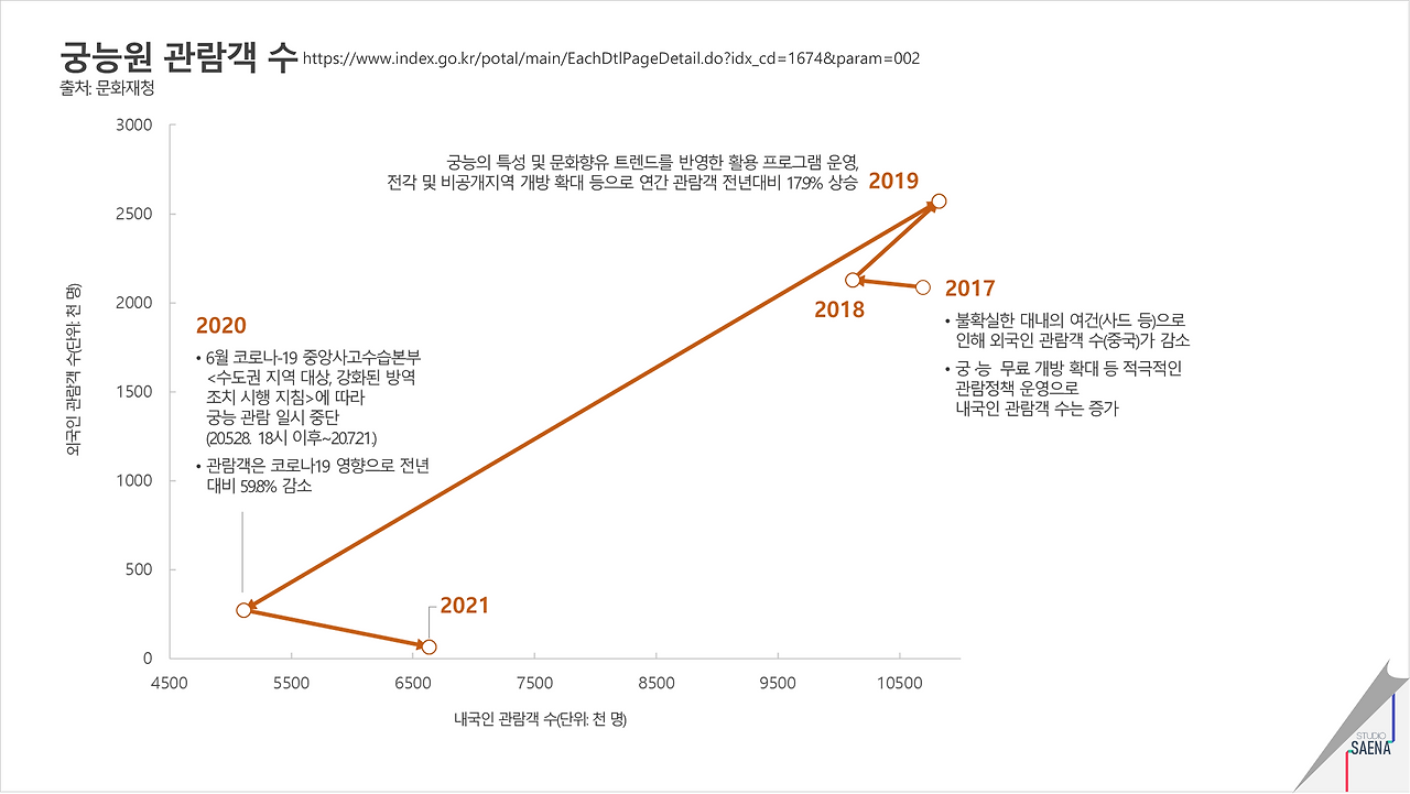 이 그래프의 x축을 살펴보면 시간 순이 아니라 수치들이 나열되어 있는 것을 볼 수 있습니다. 이 그래프는 x축과 y축의 데이터를 모두 특정한 값으로 쓰고 있는 거죠. 연도별 궁능원 관람객 수에서 내국인 관람객 수와 외국인 관람객 수가 교차하는 지점에 점을 찍고 선으로 연결하다 보니 이렇게 특이한 형태의 그래프가 나온 것입니다.