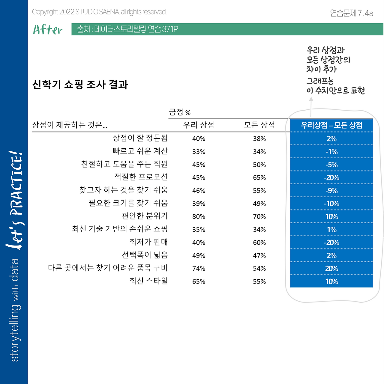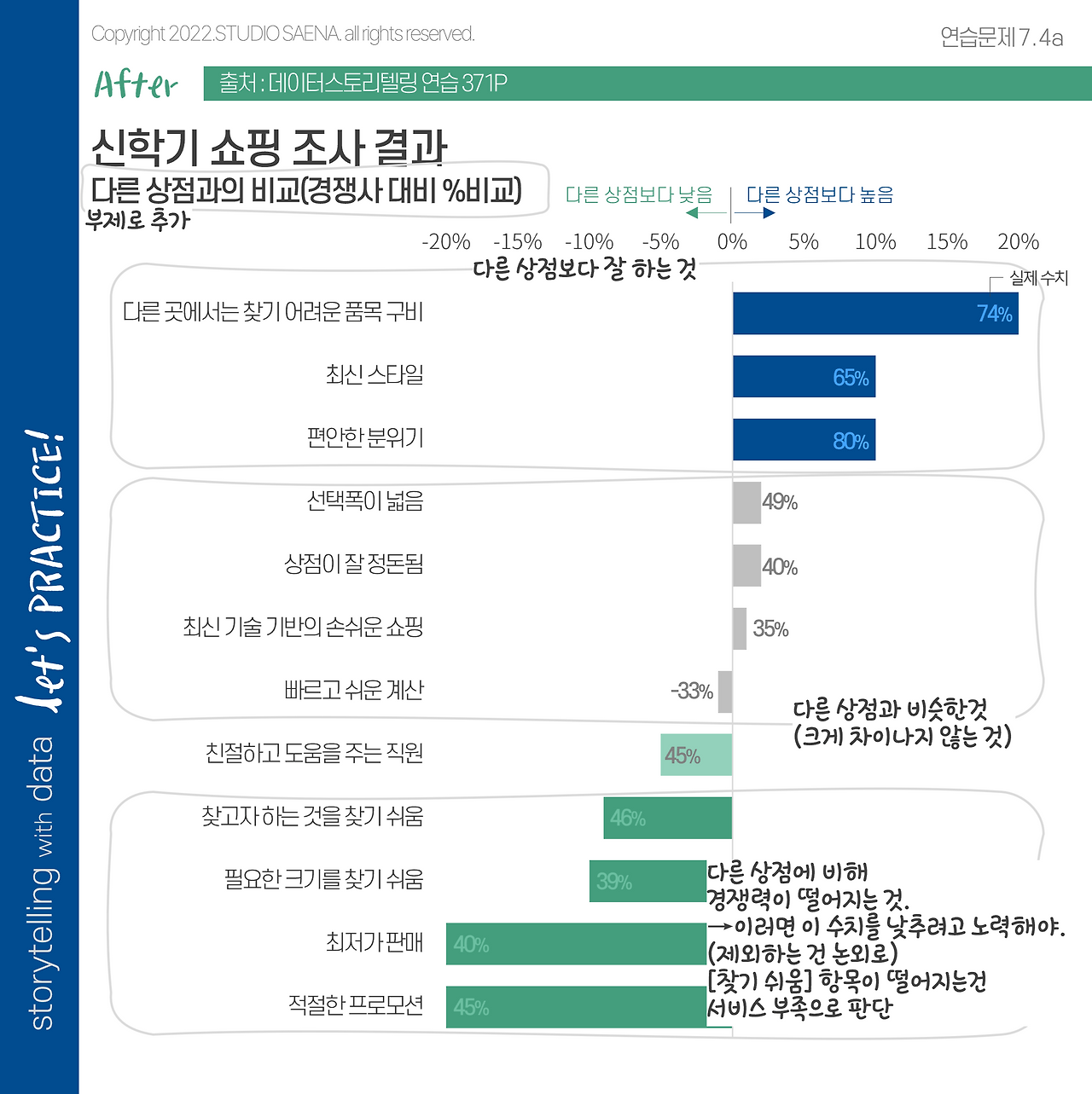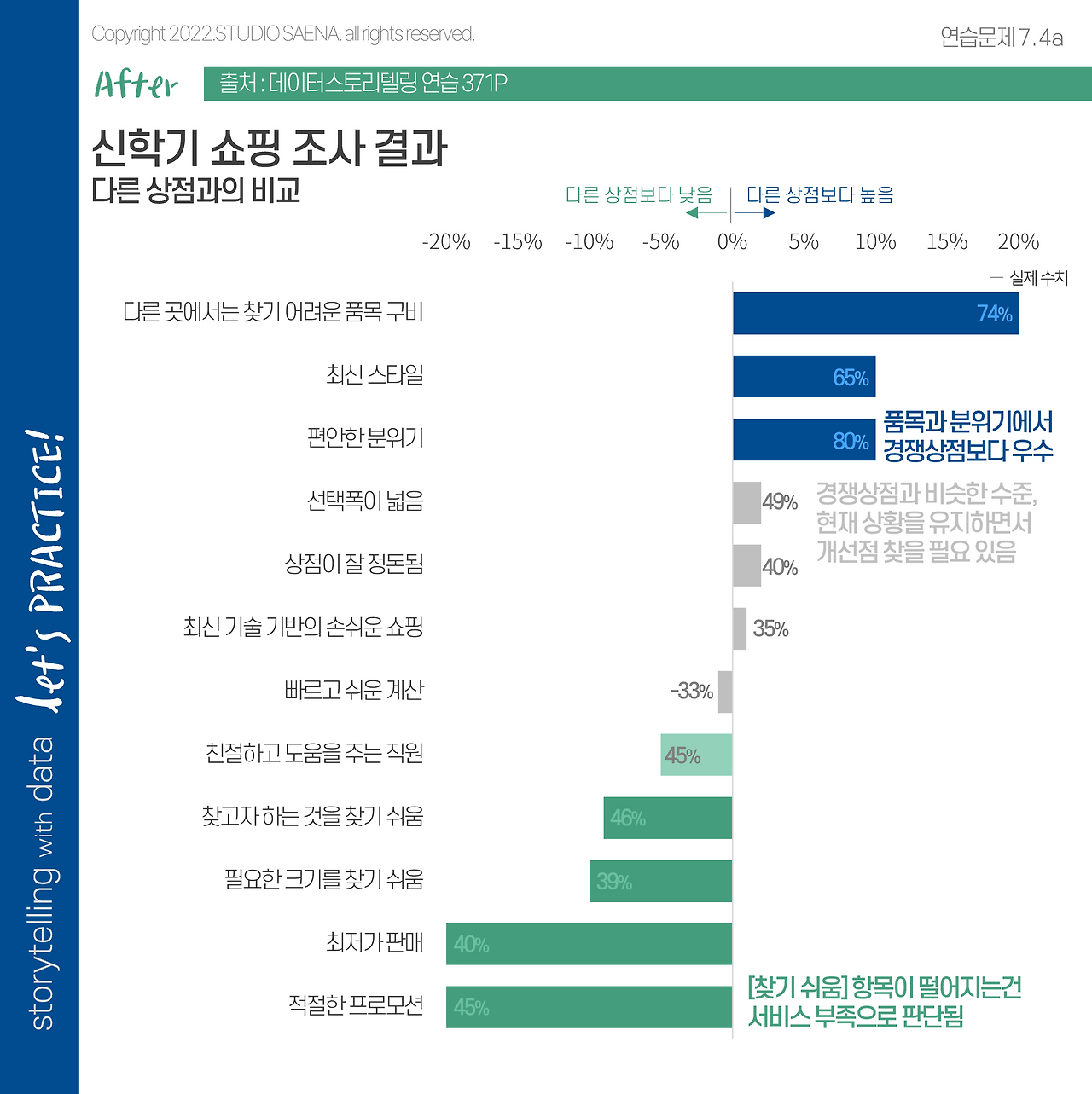 시작하기 이전에, 전 처음 덤벨차트를 이용해서 작업을 하려고 했습니다. 하지만 우리 상점과 모든 상점의 수치가 일괄적인 방향을 보이지 않더군요. 어떤 항목은 우리 상점이 높고, 어떤 항목은 모든 상점이 높습니다. 일일이 떨어진 그래프로 표현하는 건 이전에 썼던 방식이라 이번엔 책의 힘을 빌렸습니다. 결과적으로 수치 간의 차이를 시각화하는 것이 이번 자료 개선의 포인트입니다.
