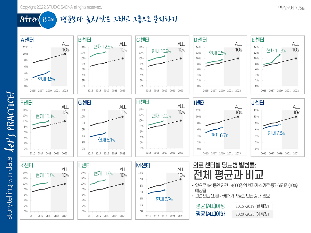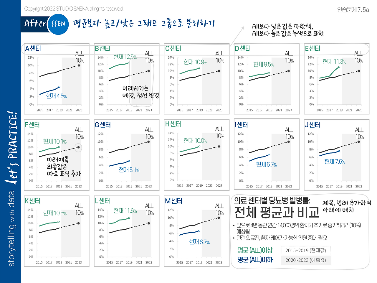 원본의 데이터를 보면 의료 센터별로 차이는 있지만 2019년 기준연도까지 당뇨병 발병률이 증가한다는 것을 볼 수 있습니다. 특히 E 센터의 데이터는 눈에 띌 만큼 늘어나고 있는데 이건 이후에 다뤄볼 부분이겠죠. 만약 E센터의 발병률이 눈에 띄게 늘어나고 있다는 것이 주요 메시지였다면 그래프 디자인 개선은 다른 방향으로 진행되었을 겁니다. 덧붙여서 원본 데이터에 추가된 모든 센터(ALL)의 2020년부터의 예상 수치도 함께 표현하려고 했습니다.