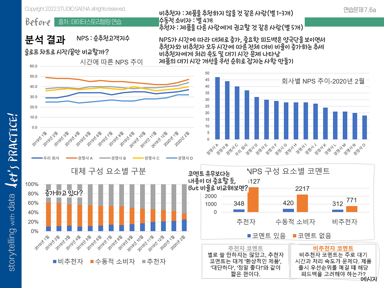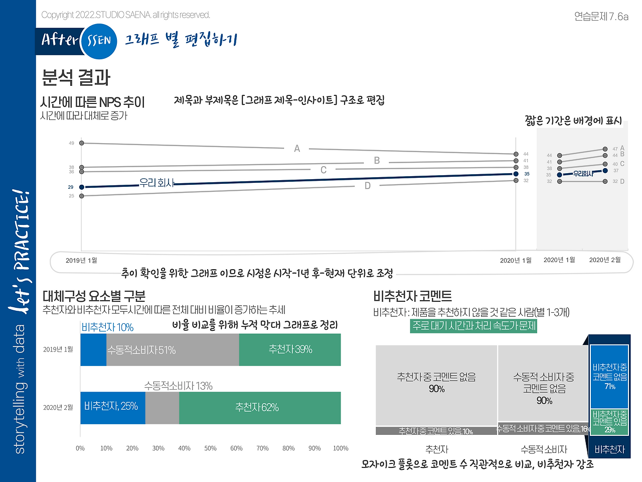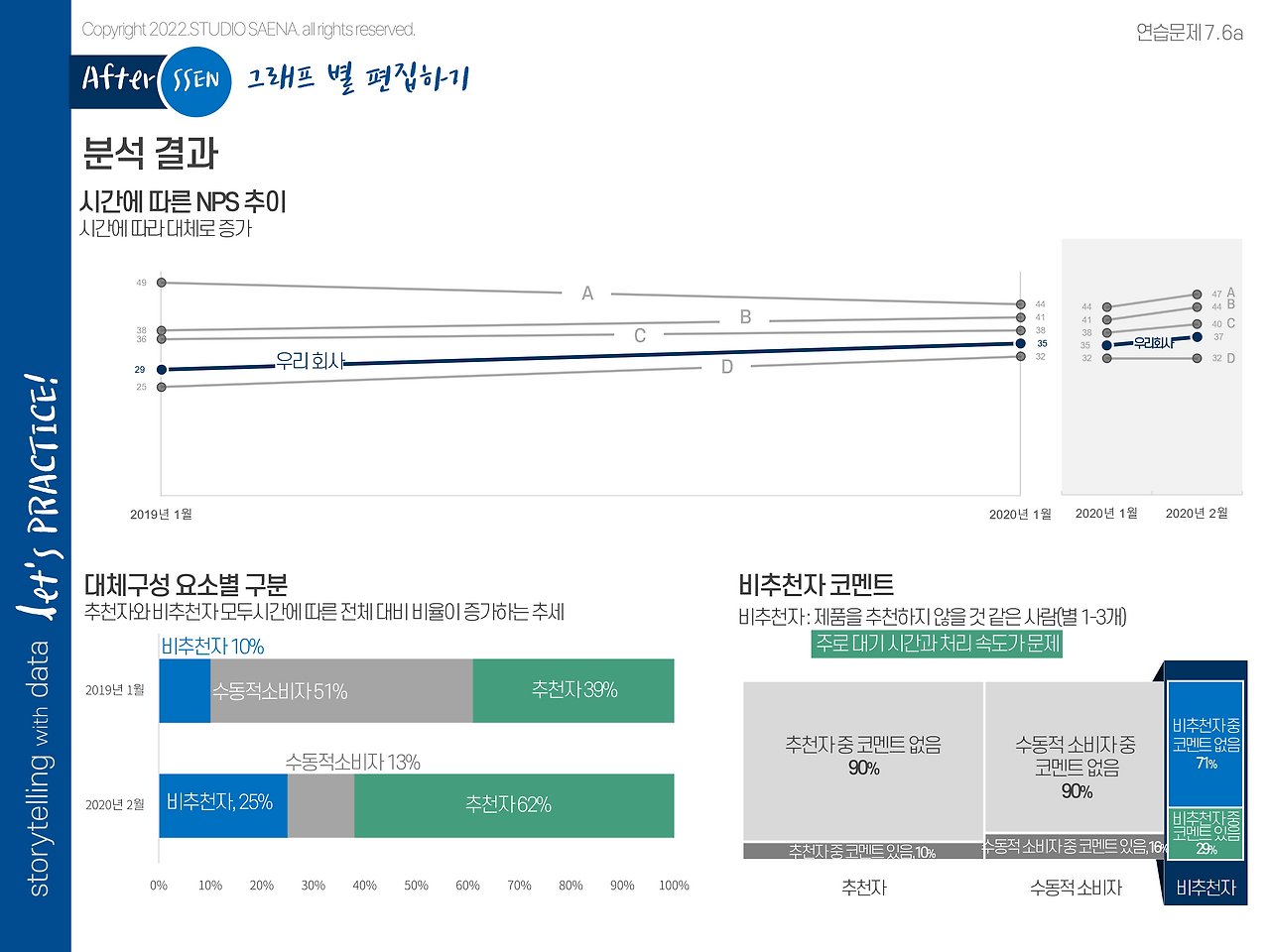 비추천자 코멘트에서는 대기 시간과 처리 속도가 문제라는 멘트를 좀 더 강조하는 방법을 썼고, 비율을 비교할 때 레이블을 조금 더 자세히 써서 구분을 확실히 하도록 했습니다. [추천자 중]-[코멘트 없음] 식으로 표현해야 비율을 비교하는데 어려움이 없을 거라고 생각했습니다.