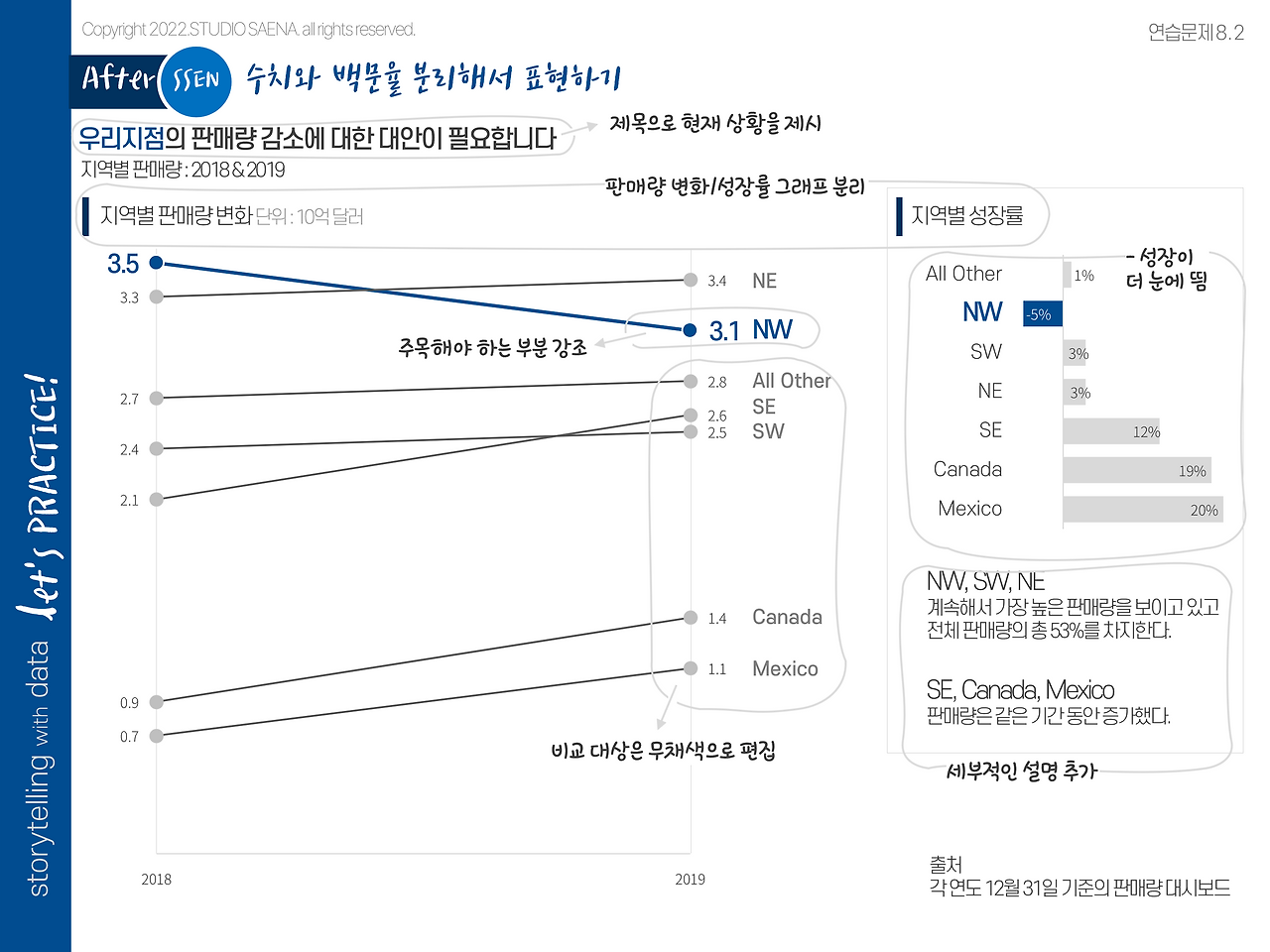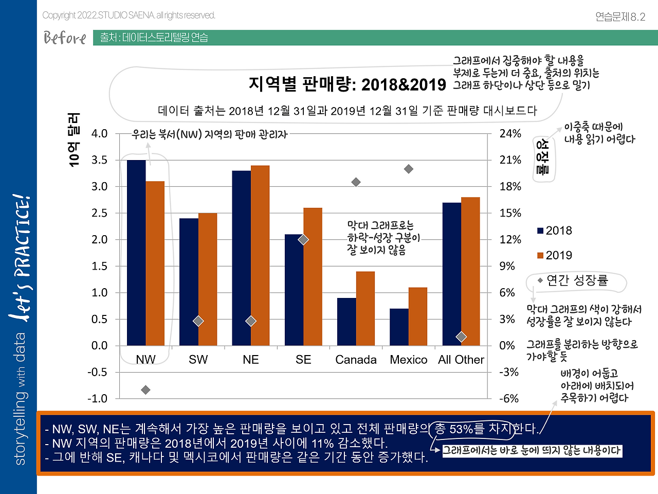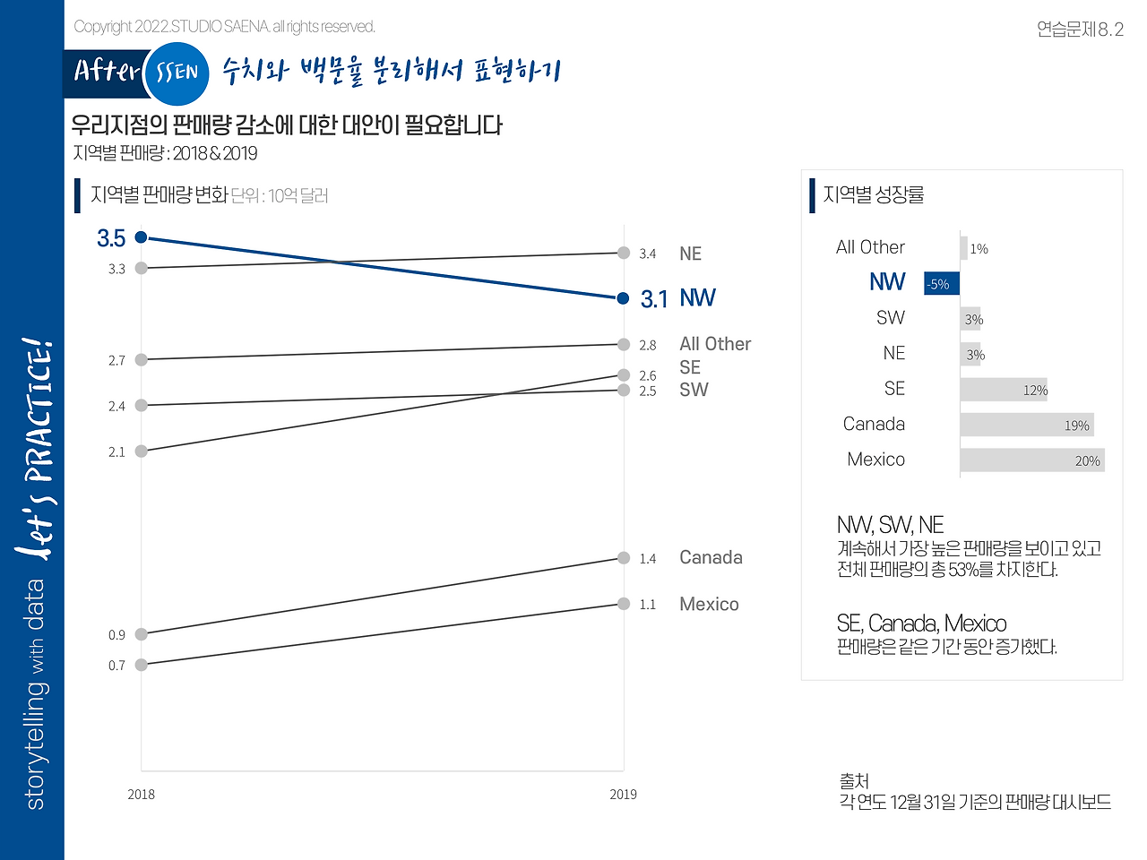 ★이 컨텐츠는 데이터 스토리텔링 연습!(콜 누스바우머 내플릭 지음 | 변혜정 옮김 | 에이콘출판 | 2021.06.30 출간)의 연습문제를 푸는 형식으로 진행되고 있습니다. 원본의 데이터는 책에 포함된 문제들이며 포스팅하는 이미지들은 제가 새롭게 제작한 것입니다.