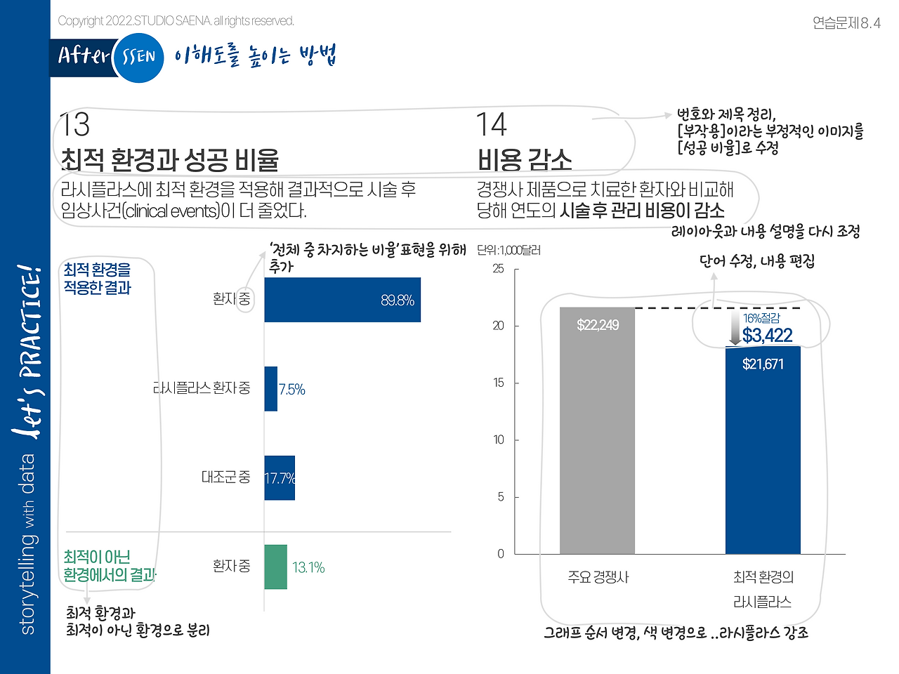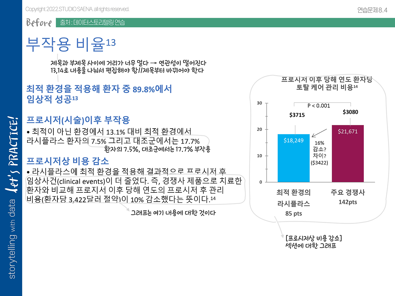 이렇게 되면 전문용어뿐만이 아니라 레이아웃의 문제로도 내용 파악이 어렵다는 것을 알 수 있습니다. 제목 크기로 봐서는 [부작용 비율]을 주로 이야기할 것 같은데 그것 외에도 [비용 감소] 항목이 있는 거죠. 즉 이 슬라이드에서의 제목은 두 개여야 하는 상황입니다.