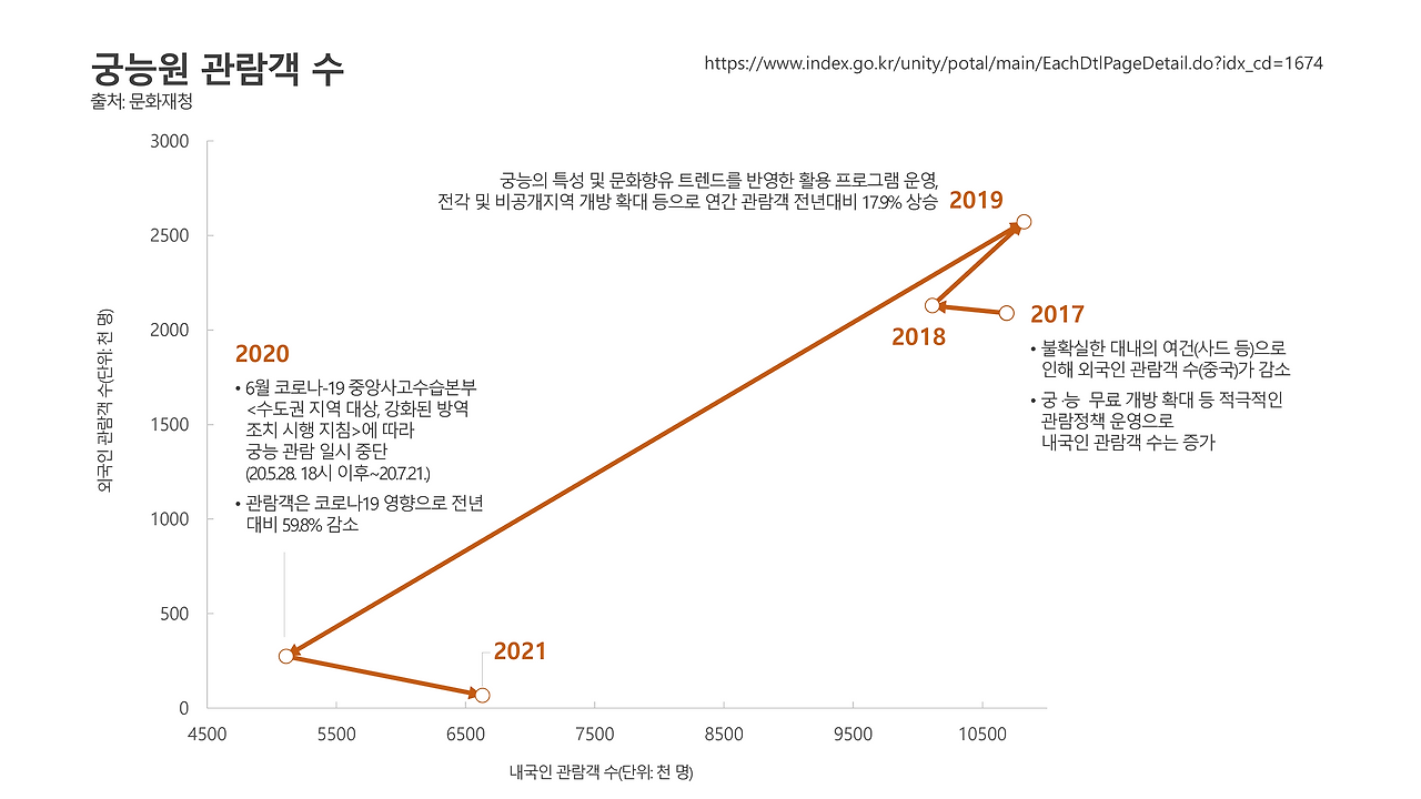 데이터는 공공데이터인 e-나라지표의 궁능원 관람객 수에서 참고했고요, 내국인과 외국인관람객은 표를 참고해서 따로 계산했습니다.