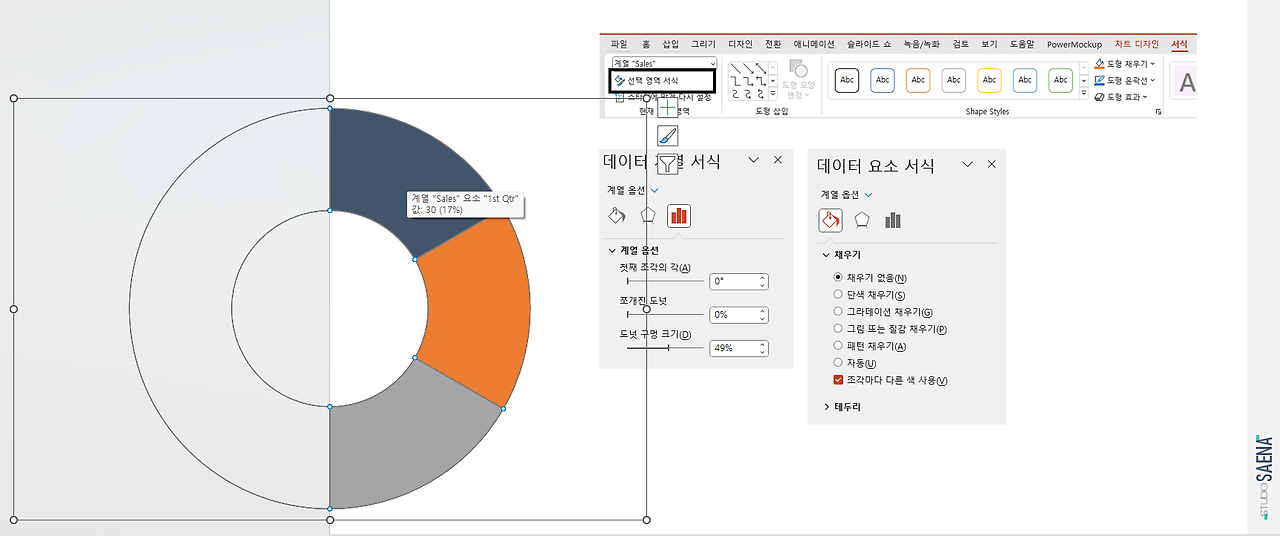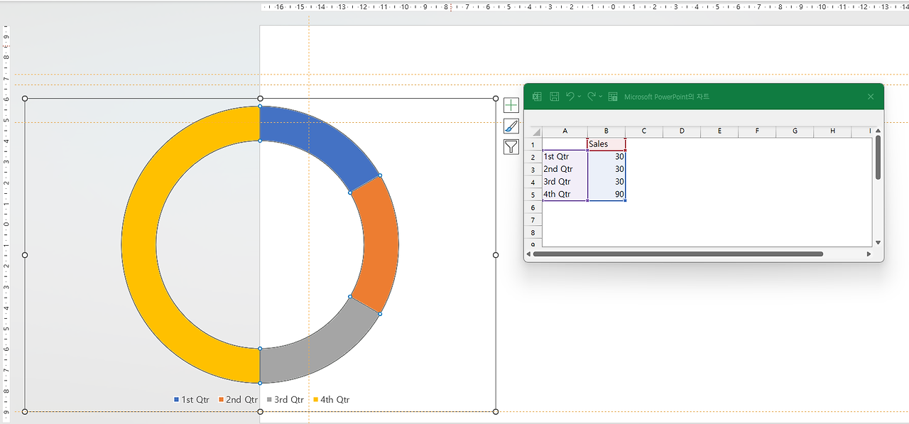 그래프의 색과 구멍의 크기 등은 차트 편집 기능을 통해 하면 됩니다. 단, 이미지에서 4th Qtr로 표시되어 있는 마지막 조각은 [채우기 색 없음]으로 편집해 주세요.