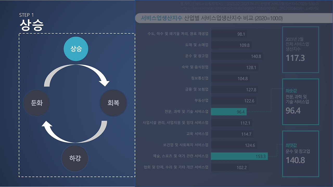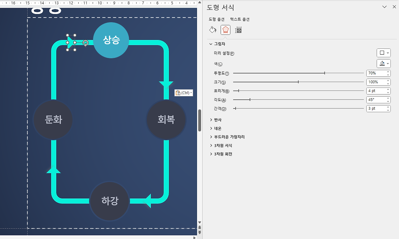 이번에 찾은 사례는 경제 주기 분석 표현인데요. 일정 주기들이 계속 반복되고 그 주기에 해당되는 그래프를 슬라이드의 한편에 넣어야 하는 다음 상황을 봅시다.