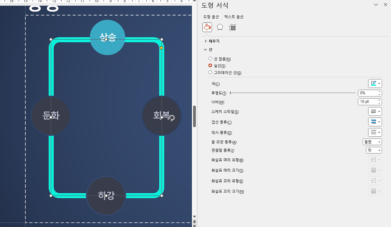 저는 여기에서 기존의 선을 휘는 건 결과가 좋지 않으니 (귀찮으니) 이미 휘어져 있는 선을 써보자고 생각했습니다. 이때 꼭 선이나 화살표를 쓰지 않아도 된다고 생각하면 답안은 훨씬 많아집니다. 전 여기에서 모서리가 둥근 직사각형의 테두리를 생각했죠. 도형을 그리고 테두리의 두께를 10pt 이상으로 올려봅니다.