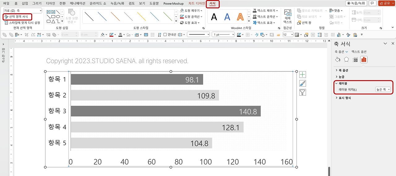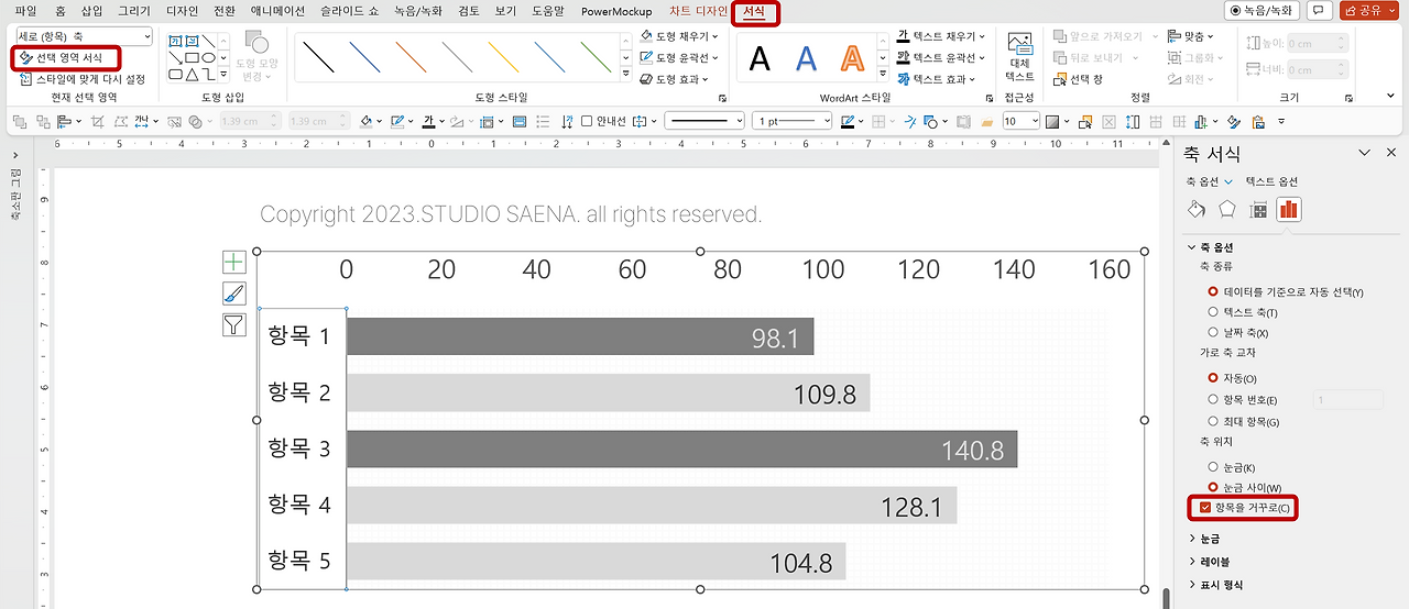 가로 방향의 막대그래프는 데이터를 입력한 순서에 따라 아래에서 위로 게시되기 때문에 우리가 생각한 순서와는 반대로 나열됩니다. 흔히 이 현상을 막기 위해 그래프의 항목 명을 선택한 후 [서식]-[선택 영역 서식]-[항목을 거꾸로]를 선택하는데요.