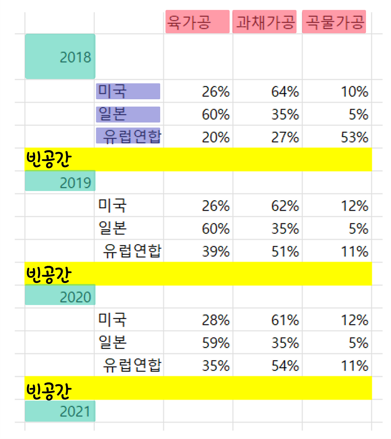 3) 더미 데이터(실제로 없는 데이터)를 만드는 능력이 없어서 실제 데이터를 활용했습니다. 참고한 해외포스팅과 가장 비슷한 구조의 데이터를 농림축산식품부&한국농수산식품유통공사에서 발간한 2022 식품통계(해외 편)에서 몇 개 국가/식품군 용어만 뽑아서 구성했습니다.