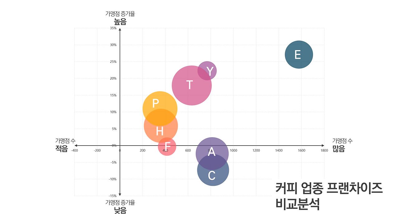 매장 수의 중앙값을 중심축으로 했을 때 중앙값의 오른편에 놓인 브랜드들은 현재 시장에서 매장수가 많은 브랜드들이라고 볼 수 있습니다. 만약 매장 수를 늘리는 방법으로 시장에 뛰어들려는 분석자가 있다면 이 브랜드들을 벤치마킹 해볼 수 있겠네요.
