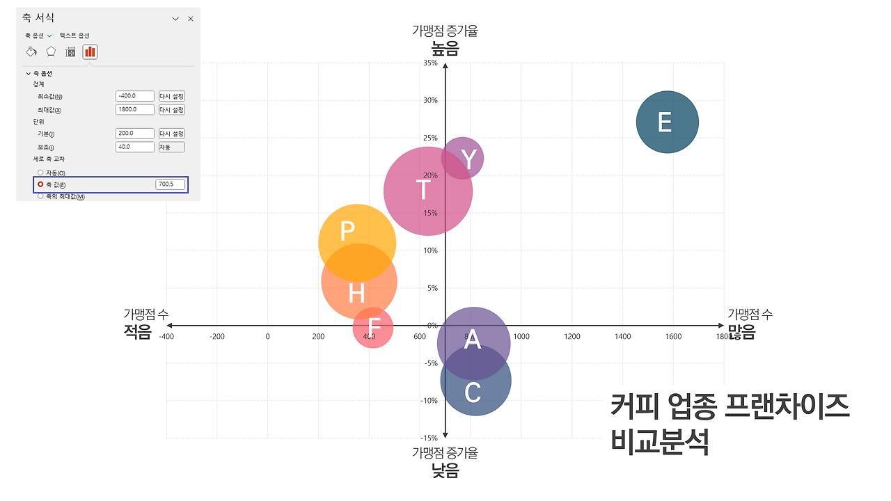 엑셀에서 MEDIAN 함수를 이용하면 데이터들의 중앙값을 구할 수 있습니다. 매장 수의 중앙값을 가운데 축 값으로 지정해서 브랜드들의 매장 수가 현재 어느 정도로 많고 적은 지를 확인할 수 있습니다.