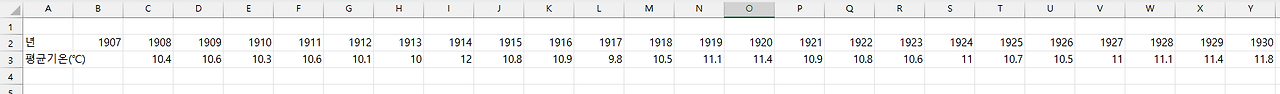 스트라이프 차트가 빽빽한 띠 형태로 보이는 것은 그만큼 다루는 기간이 많기 때문입니다. 우리나라 통계청 기준으로는 1907년부터 데이터가 나와 있어서 연평균 온도를 엑셀에 가로로 나열해 보았습니다.