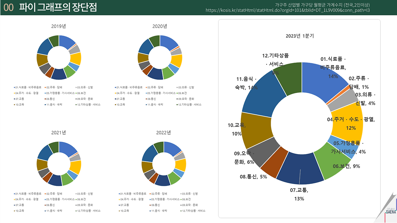 2019년부터 2023년까지 계속 변하는 가구당 소비항목 비율을 모두 파이 그래프로 표현하다보니 원형의 파이 그래프가 들어갈 공간이 부족해서 필요 이상으로 작아지는 경우가 생깁니다. 이번 웨비나는 이런 그래프와 데이터를 어떻게 잘 시각화할 수 있을지 그래프를 대체하고 응용하는 방법에 대해 알아봅니다.