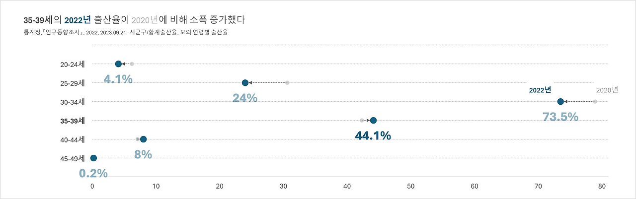 연령별 출산율을 살펴보면 다른 연령대에 비해 35-39세, 40-44세의 출산율이 소폭 증가한 것을 볼 수 있습니다. 기존 연령대중 가장 높은 출산율을 가지고 있던 30-34세의 출산율은 2020년에 비해 큰 폭으로 떨어졌음을 화살표의 길이로 추측할 수 있습니다. 이 현상은 25-29세에서도 비슷하게 일어나고 있네요. 아이를 가지지 않거나 늦게 가지는 현상을 확인하고자 한다면 이 데이터와 그래프가 적절할 것으로 보입니다.
