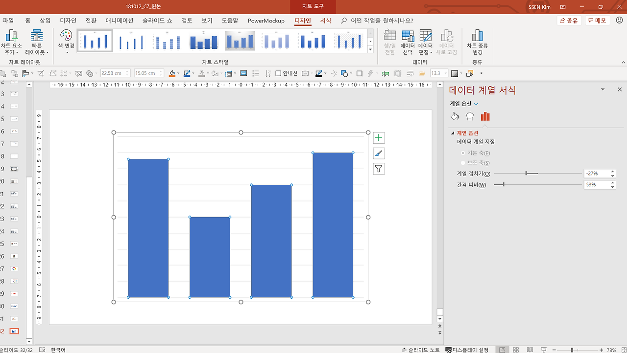 최근 온라인 강의 작업 중 이 차트 기능을 활용해서 그래프를 작업해 보았습니다. 차트 메뉴를 활용해서 이 정도의 이미지 수정이 가능하구나 정도로 생각하면 될 것 같습니다. 정보와 수치의 위치나 삽입은 [차트 도구]-[디자인 서식]-[차트 요소 추가]에서, 그래프의 너비나 색, 투명도 등은 [해당 개체에서 오른쪽 단추 클릭]-[데이터 계열 서식]에서 해결했습니다.