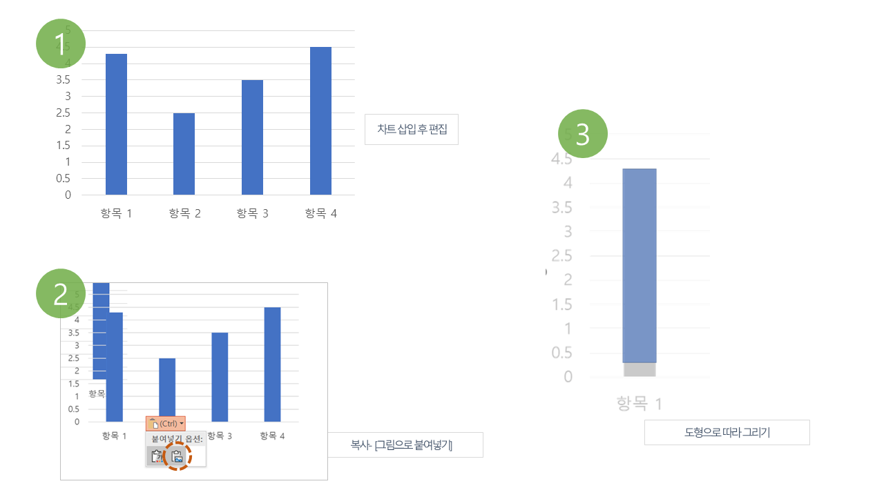 그래프를 복사해서 이미지로 한번 바꿔주면 다른 개체들을 건드리지 않고 도형으로 바로 따라 그려줄 수 있습니다다. 강의 때도 몇 번씩 설명하는 과정인데 아무래도 손에 익지 않으면 헷갈리죠. 하지만 그래프 위에 도형을 직접 그렸다가 몇 번 실패해본 저로서는(그래프와 도형이 붙어서 그래프와 같이 움직이거나 같이 편집돼버리는 현상이 있습니다.) 이 방법이 제일 확실합니다.