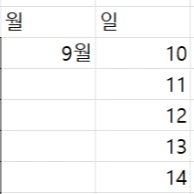 분리된 데이터에 '표시 형식'을 이용해 "월"이라는 단어를 붙여주고 9월과 10월 시작 지점 빼고는 나머지는 다 지워줍니다.