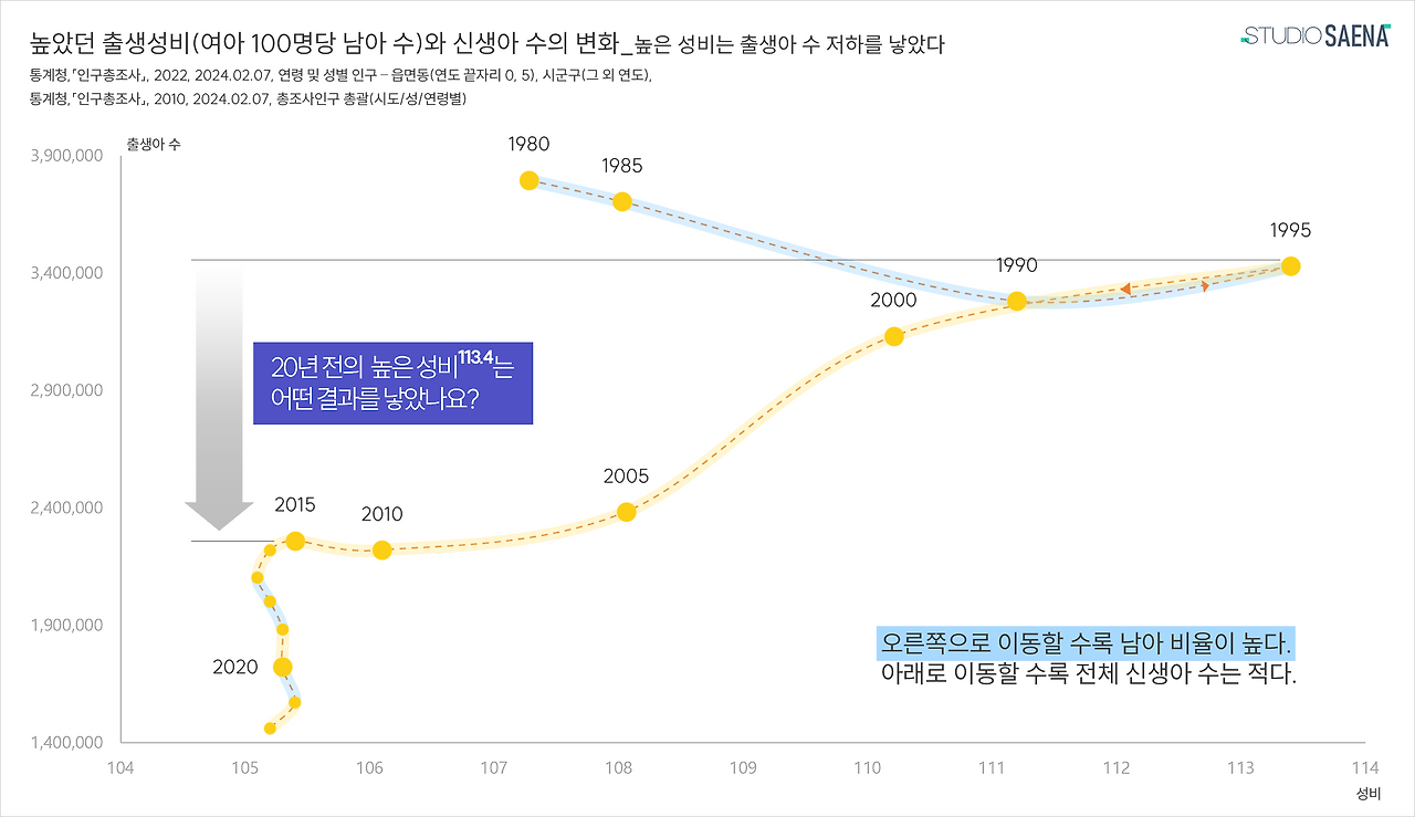 신생아 수는 수직 하락하고 있지만, 다행히 성비는 과거에 비해 낮아지고 있습니다. 여성과 남성의 수가 어느정도 비슷하게 태어나는 시기가 있고 그 시기가 특정 기간동안 쌓여야 출생아 수에 대한 변화도 생기겠죠.