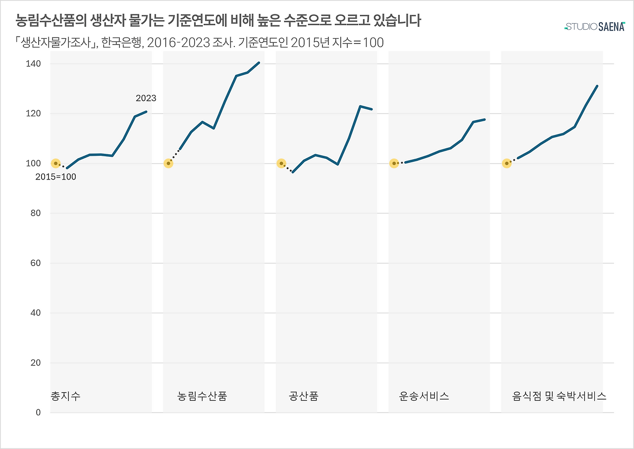 이런 방식은 기준연도 지점부터 2023년 최종 연도까지의 지수가 얼마나 가팔라졌는지, 즉 흐름을 보기에 유용합니다. 전체적인 지수의 증가를 나타내는 데에는 이 방식이, 각 연도별 기준연도와의 차이가 얼마자 생겼는지를 각각 비교하기엔 첫 번째 방식이 좀 더 유용할 것 같습니다. 물론 두 가지 방법 모두 농림수산품의 생산자 물가가 매우 오른 상태라는 것을 파악하기에 크게 모자란 부분은 없겠지만요.