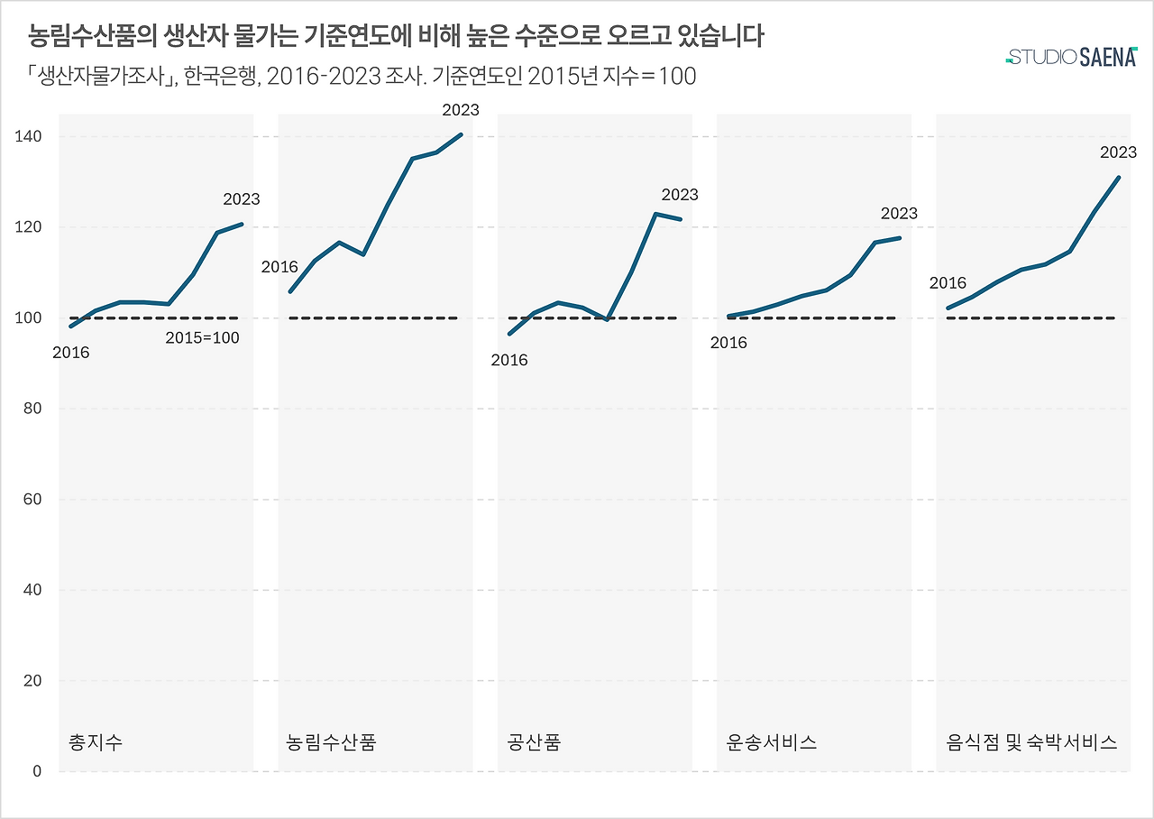 첫 번째는 그래프에 지수를 직접 선 그래프로 추가하는 방법입니다. 아래 그래프는 생산자 물가 지수를 총지수부터 음식점 및 숙박서비스까지 항목별로 구분하고 있는데요. 이때 기준이 되는 2015년의 지수를 점선으로 그래프에 추가했습니다.