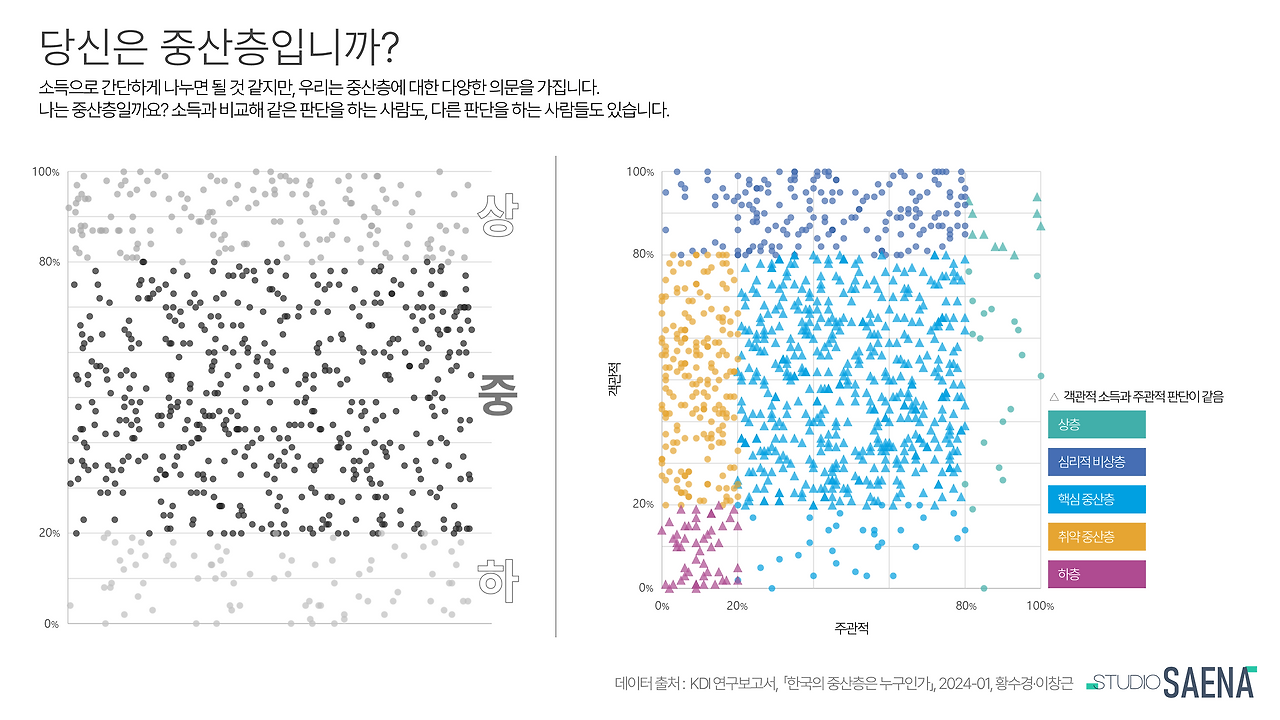 그래프 하나에 여러 가지 해석이 있을 수 있겠습니다만 하나만 짚어보자면, 주관적으로 본인을 0-20% 지점의 하층으로 생각하는 둥근 점의 개수가 80% 이상으로 본인을 판단하는 상층의 둥근 점의 개수보다 훨씬 많다는 점입니다. 객관적 소득으로 20-80%에 해당하는 중산층 중 실제로 자신을 하층으로 생각하는 노란색 원형 점의 밀도가 높은 것은 과하게 보자면 본인의 소득과 능력을 과소평가하고 있는 사람의 수도 많다는 것을 뜻하겠죠.