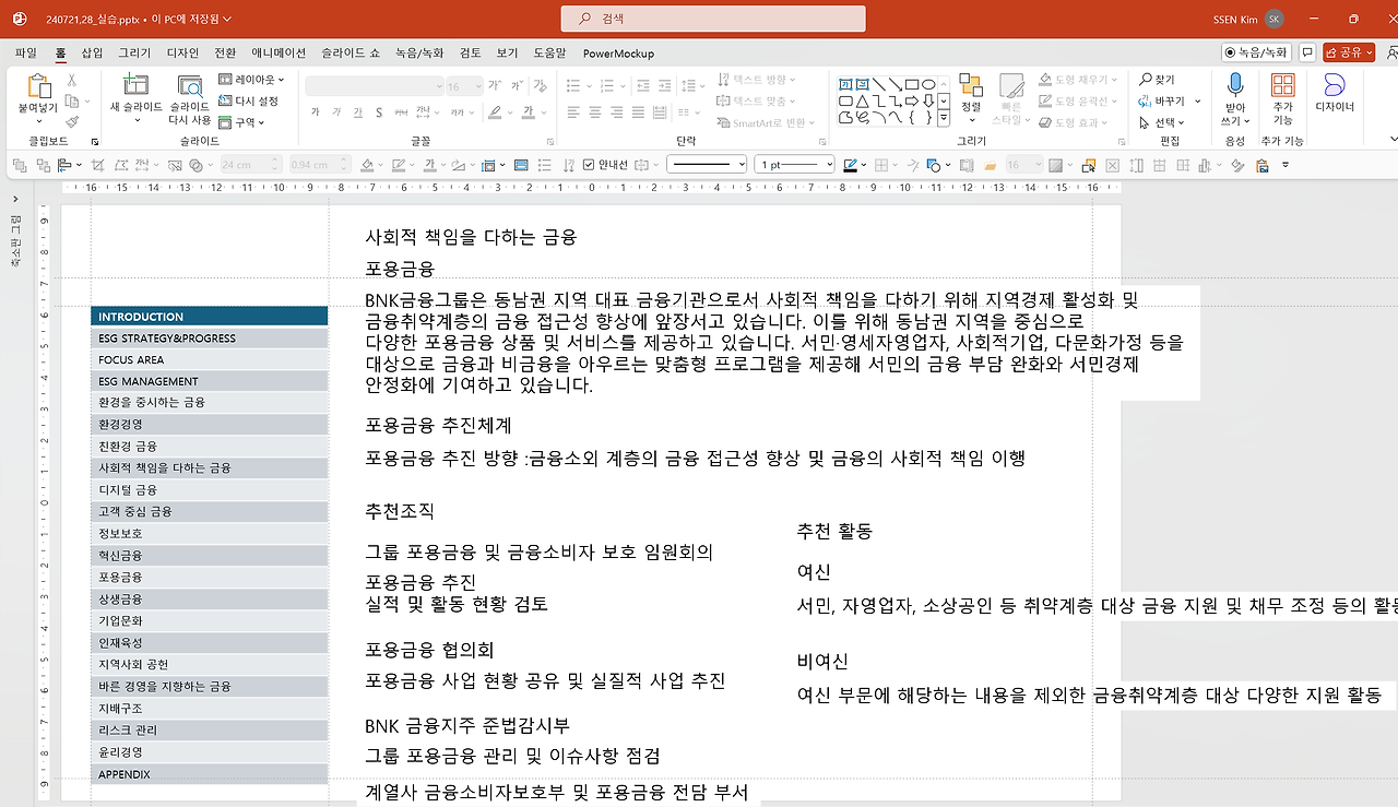 위의 내용을 바탕으로 해서 1차 변경본을 만들어봅니다. 이 자료의 경우 원본(https://www.bnkfg.com/09/04.jsp )의 자료를 바탕으로 한 슬라이드의 요약본입니다. 기존의 디자인을 16:9 비율로 압축한 레퍼런스용 자료입니다.