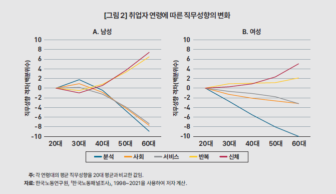 KDI의 '직무분석을 통해 살펴본 중장년 노동시장의 현황과 개선방안'이라는 보고서에서는 연령대에 따라 달라지는 평균 직무 성향에 대한 그래프를 소개했습니다. 그래프의 형태로 보아 우리나라는 연령대가 높을수록 신체적인 업무나 반복되는 성격을 가진 업무를 주로 하고 있다는 주장인데요.