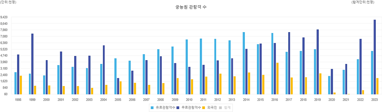 우리나라의 특정 관광지에 방문한 관람객 수를 시각화한 이미지를 가지고 왔습니다. e-나라지표 사이트에서 쉽게 다운로드할 수 있는 막대그래프 형식입니다.