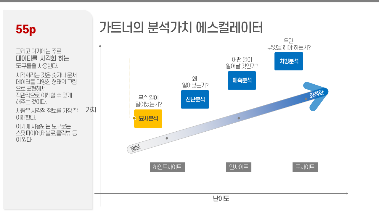 다른 내용들도 좋았지만 아래의 이미지는 꼭 내 방식대로 바꿔보고 싶었습니다. 가트너라는 IT 컨설팅 회사가 정리한 분석의 4단계-가트너의 분석 가치 에스컬레이터라는 것인데요. 마침 플리커에서 원본 이미지를 공유하고 있어서 가지고 왔습니다.