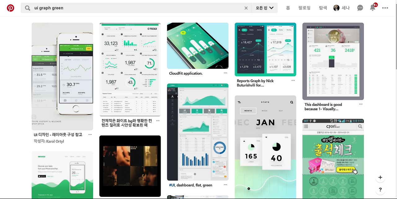 핀터레스트는 사이트 상단의 검색어를 입력해서 사용자가 원하는 이미지들을 큐레이션 할 수 있도록 한다. 즉 검색어가 바뀌면 나오는 이미지들도 바뀐다는 것. ppt , 템플릿 까지만 입력했다면 여기에 색이나(green, red, blue...), 개체를 추가해보자(line graph, pie graph, diagram...) 훨씬 원하는 스타일에 가까이 다가간 이미지들을 찾을 수 있다.