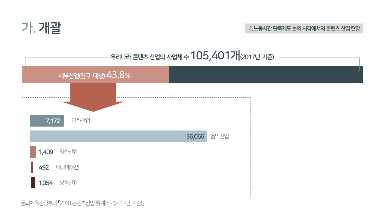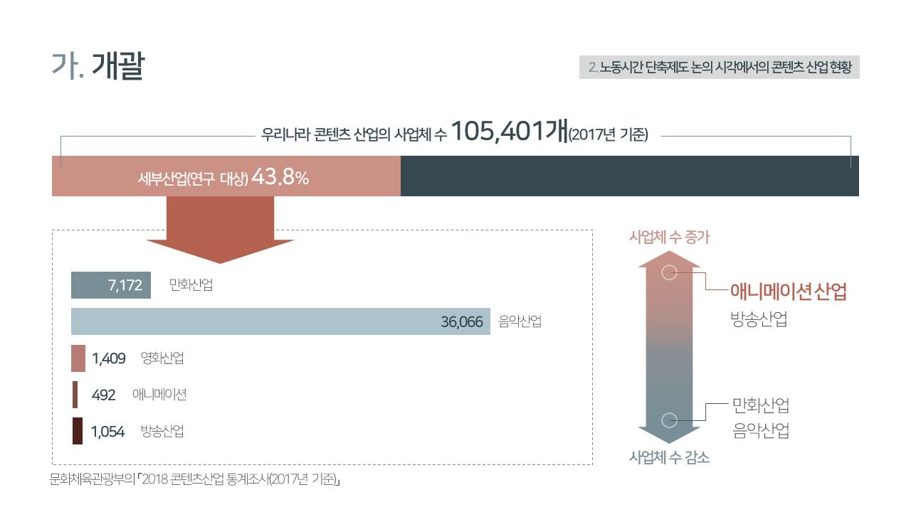 2017년 기준 우리나라 콘텐츠산업의 사업체 수는 총 105,401개로 나타난다. 그중 본 연구의 대상이 되는 세부 산업은 만화산업 7,172개, 음악산업 36,066개, 영화산업 1,409개, 애니메이션 산업 492개, 방송산업 1,054개로 전체의 43.8%에 해당한다.