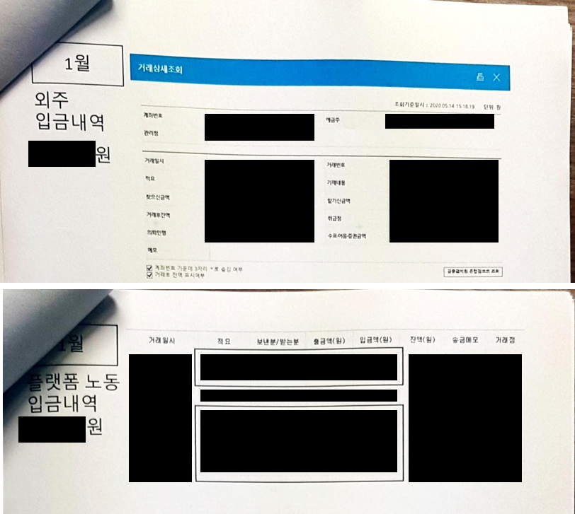 내 경우 외주 제작을 통해 돈이 입금되는 계좌, 플랫폼 사이트를 통한 노동을 통해 돈이 입금되는 계좌가 다른데 이 두 곳의 입금내역을 모두 출력해갔다. 입금 금액은 따로 표시했다.