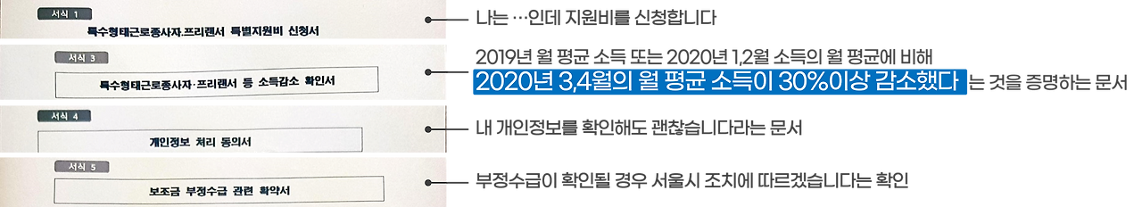 서울시 제공 서식을 조금 자세히 설명하면 아래와 같다. 주위에서 서류가 많다고 놀라길래 이렇게 설명해 줬다. 서류 자체들은 작성하는데 크게 어렵지 않은데(이름 쓰고 사인하는 수준) 서식 3번이 조금 까다롭다. 내 경우 지속적으로 계약해서 근무하는 형태가 아닌 단기적으로 소득이 생기는 프리랜서이기 때문에 소득 감소 확인서로 진행했는데, 근무지가 있을 경우 일을 하지 않았다는 사업장의 확인서를 챙겨보는 것도 방법이다.