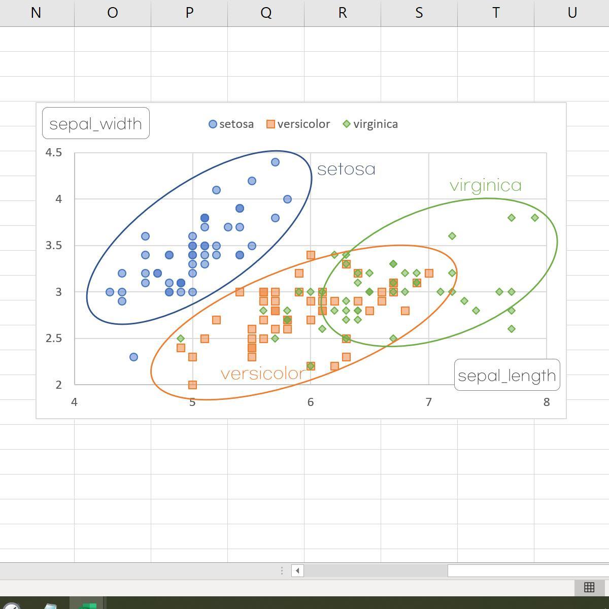 이번 건 원본 데이터 어렵겠다...이랬는데 구글에 꽃받침 너비만 검색해도 데이터 관련 사이트들이 줄줄이. 알고보니 머신러닝이나 데이터 분야에서 자주 쓰이는 데이터셋이라고. 오늘은 산점도만 편집. 계열별로 다른 도형과 색으로 편집하고 타원 추가해서 범례 표현한 그래프 카피캣. 엥간해선 범례 안 지우는 방향으로 가는데 이런 식으로 표현하면 좀 더 직관적으로 계열 구분이 되는 듯 하다. 데이터 출처는 https://gomguard.tistory.com/m/148?category=711752