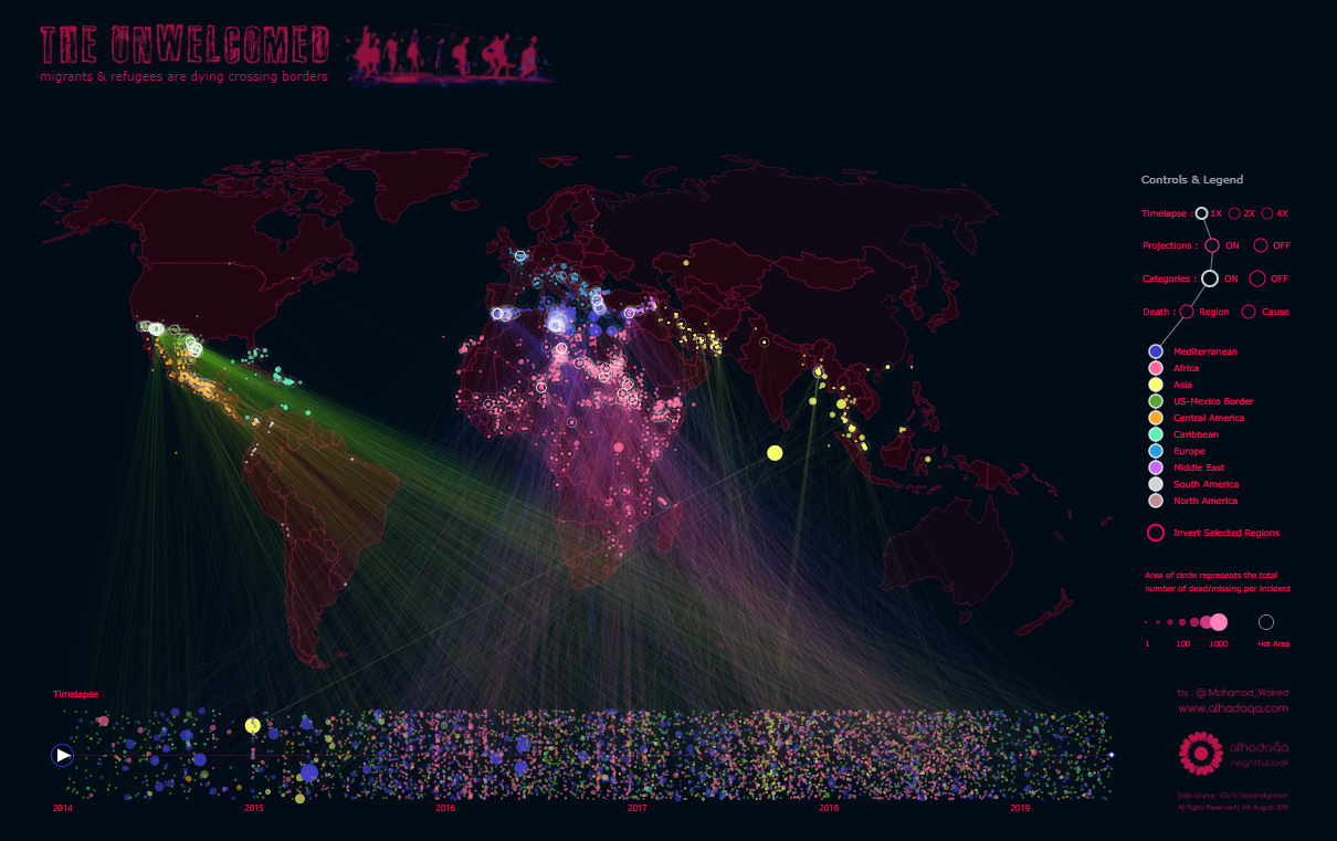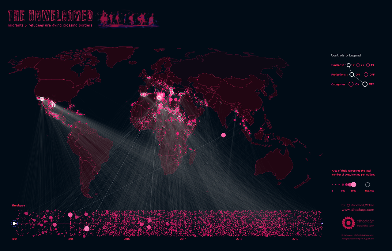 세계지도를 중심으로 2014년부터 2019년까지의 실종과 사망사건 추이를 보여주는 그래프에서 사용자들은 직접 컨트롤러를 조정하여 재생속도, 연결 선의 유무, 사고 지역과 원인들을 나눠서 볼 수 있다. 어떤 프로그램이나 새로운 것들을 배울 때 이것저것 만져보라고 하는데 그 규칙은 여기에서도 통한다. 그래프의 모습이 변하는 것을 보면서 시간이 지날수록 작은 사고들이 동시다발적으로 점점 중동지역에서 먼바다에서도 생겨난다는 것을 추측할 수 있다.