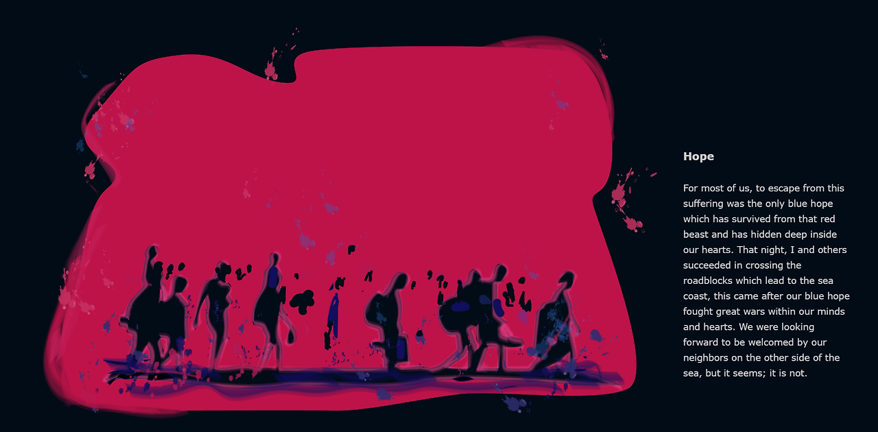 이 페이지는 총 두 개의 다른 페이지와 연결이 된다. 하나는 난민들의 실종, 사망 사건을 스크롤로 보여주는 스토리 페이지, 나머지 하나는 지금까지 일어나고 있는 사고들을 보여주는 데이터. 무표정하게 스크롤을 내리다 보면 화려하게 바뀌거나 점에서 면으로 바뀌는 그래프들을 볼 수 있는데, 결국 이것 하나하나가 실종되거나 사망한 사람들이란 것을 생각하면 마음이 무거워진다.