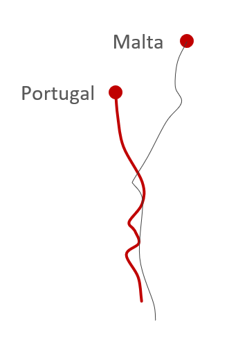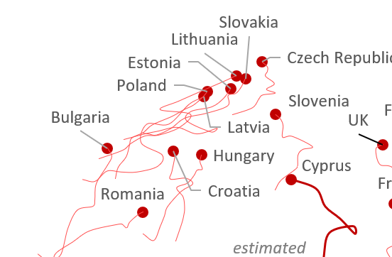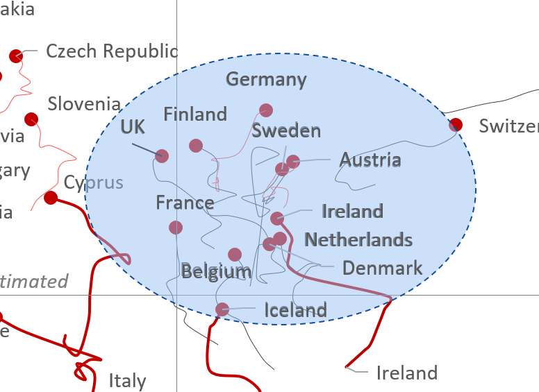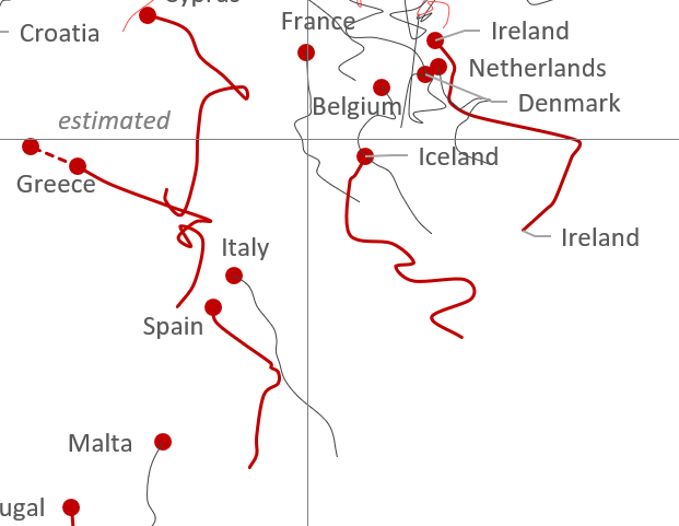 붉은색 두꺼운 꼬리 : 멀리 떨어져 있어도 여러 국가들을 그룹화해준다.(재정적 위기, 국가 부채로 어려움에 처한 나라들을 의미한다.)
