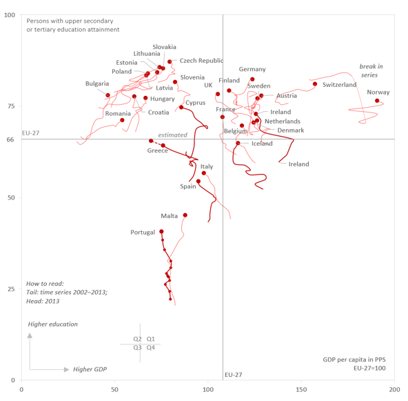 위의 포스팅에서 사용된 차트는 2002년~2013년 동안의 유럽의 국민총생산(GDP)을 대비해 본 교육 수준을 산점도로 표현한 것이며, 원본 이미지는 아래의 이미지와 블로그에서 확인 가능하다.