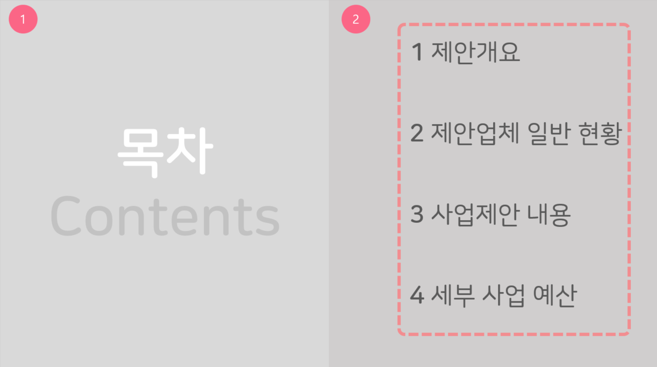 이렇게 파워포인트 기능으로만 정렬이 해결되면 다행인데, 문서의 레이아웃 상 정렬 기능만으로는 해결이 안 되는 경우가 있습니다. 아래 이미지에서 분홍색 점선으로 싸여 있는 텍스트들을 2번 공간(분홍색 원으로 표시된) 안에 배치하려 합니다. 방법은 여러 가지가 있겠지만 1부터 4까지의 개체는 왼쪽 정렬로 하고 2번 공간의 가운데 지점에 위치하도록 만듭시다.